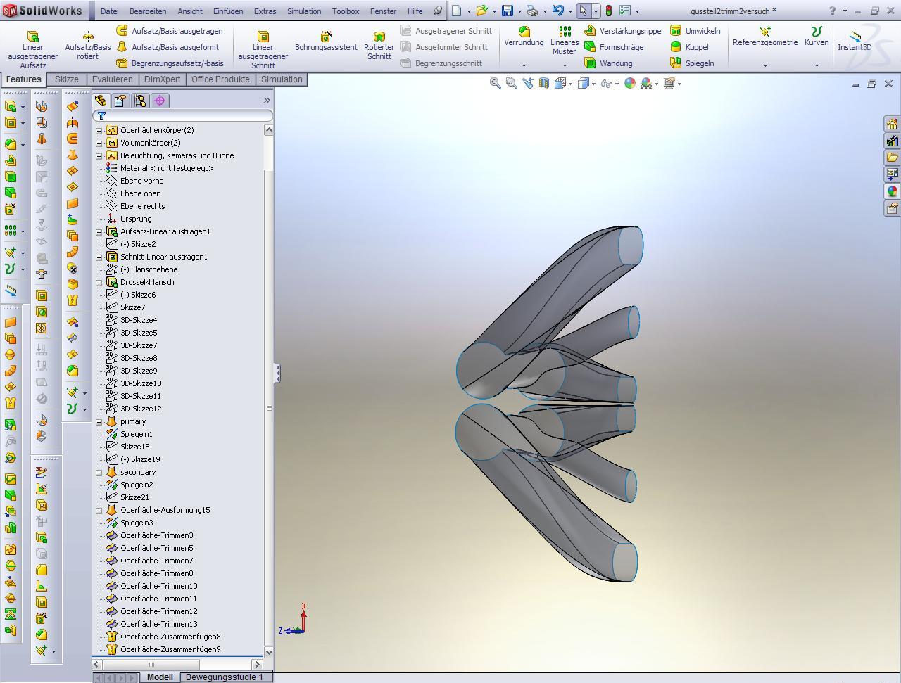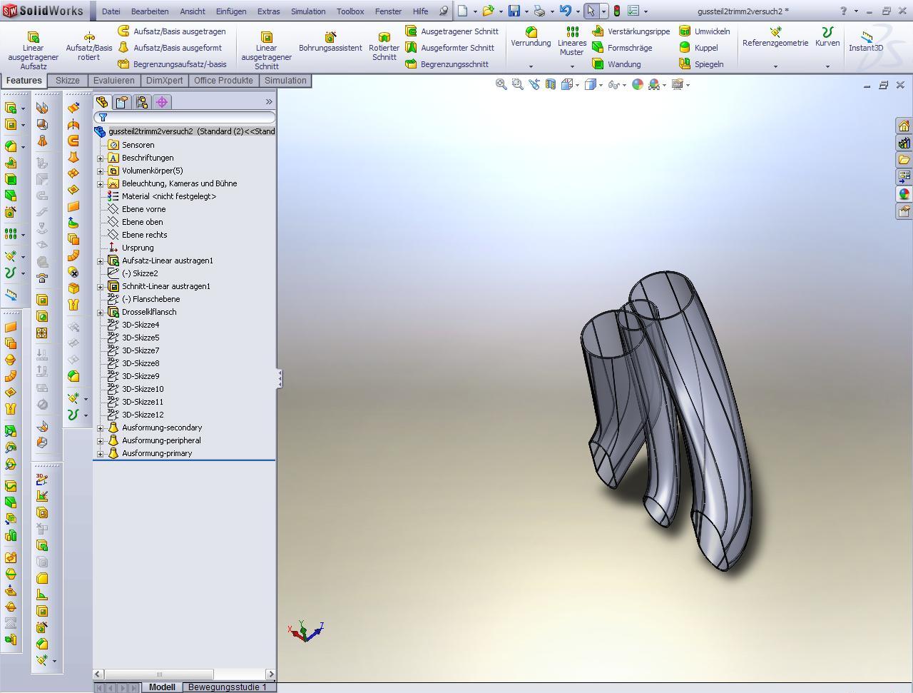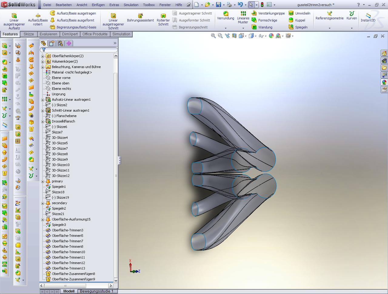 dachte schon, das heran tasten an die passende arbeitsweise ist nicht so einfach, überhaupt am anfang nicht den mut verlieren und sorry, wenn ich etwas mürrisch vorher war!!!! mach zuerst gleich voll die krümmer und dann verwende erst den befehl "wandung", vielleicht gehts besser achtung, wenn du mehrere körper hast, musst es für jeden körper extra machen bei den zwei stutzen die ineinander gehen, wirst ein wandung brauchen und für den einen stutzen der die beiden nicht berührt, wirst einmal wandung brauchen lg martin ps: das ist echt eine schwierige kontur! ------------------ Bin jetzt auch unter Skype erreichbar , einfach nach Martin Doppler in Wien suchen. Eine Antwort auf diesen Beitrag verfassen (mit Zitat/Zitat des Beitrags) IP |