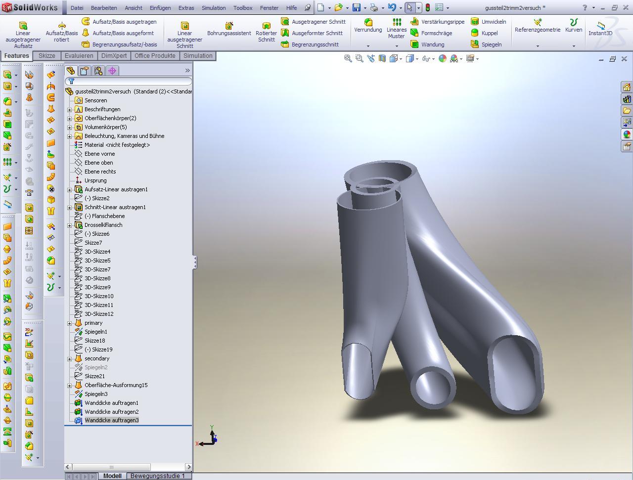 Hallo Martin, Ich habe mit Flächen begonnen, weil ich zuerst die Gussteilinnenkontur modelliert habe und mir das am einfachsten erschien. Auf anraten aus dem Forum habe ich es dann mit einem Volumenmodell umgesetzt, weil dies einfacher zu handhaben sein sollte. Zur Wandstärke. ich möchte überall mind. 8mm Wandstärke haben. Das ist scheinbar bei diesem Bauteil nicht ganz so trivial. Deswegen versuche ich mich an die Lösung des Problems ranzutasten... Dünnes Feature 1mm habe ich gewählt weil es funktionierte, im Gegensatz zu 5mm.