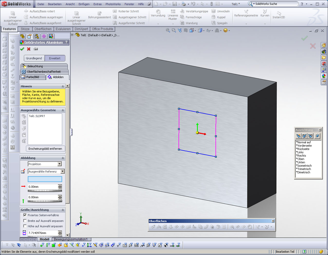 Hallo Piet, ich weiß nicht, ob´s noch was nützt, aber so, sah das mal in PhotoWorks aus! In dem Thread findest Du eine Textur, die ich für gebürstetes Metall verwendet habe. Es ist auch eine SWX Datei mit Beleuchtungssituation für PhotoWorks als ZIP dabei. Ich hab leider keine Ahnung, wie PhotoView funktioniert, arbeite stattdessen mit Autodesk Showcase. Viele Grüße Andreas Eine Antwort auf diesen Beitrag verfassen (mit Zitat/Zitat des Beitrags) IP |