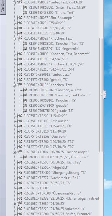 Wenn ich diese Konfigs nochmal neu erstellen WÜRDE, müßte ich erstmal neue Namen vergeben, da ja doppelt nicht geht. Und dann würden alle Infos in der Datenbank für die neue Konfig auch neu zu erstellen sein. Name, Beschreibung, Material, Lieferant... Ebenfalls müßte ich alle Baugruppen aktualisieren... Dann lasse ich die abgeleiteten Konfigs. So wichtig ist das nicht. Wäre halt nur übersichtlicher, da jetzt der Baum zugeklappt ist und ich immer erst alle Konfigs aufklappen muß, um das richtige Teil zu finden... Siehe Bild: Wenn ich jetzt Konfig R13060ESB102 suche und der Baum ist zugeklappt... finde ich sie nicht auf Anhieb.... War damals mal ein Versuch mit den Unterkonfigs, hat sich nicht bewährt... und nun sind diese Unterkonfigs eigentlich nur Altlasten. Macht aber nix.... wenn es dafür keine einfache Lösung gibt, dann kann es auch so bleiben....