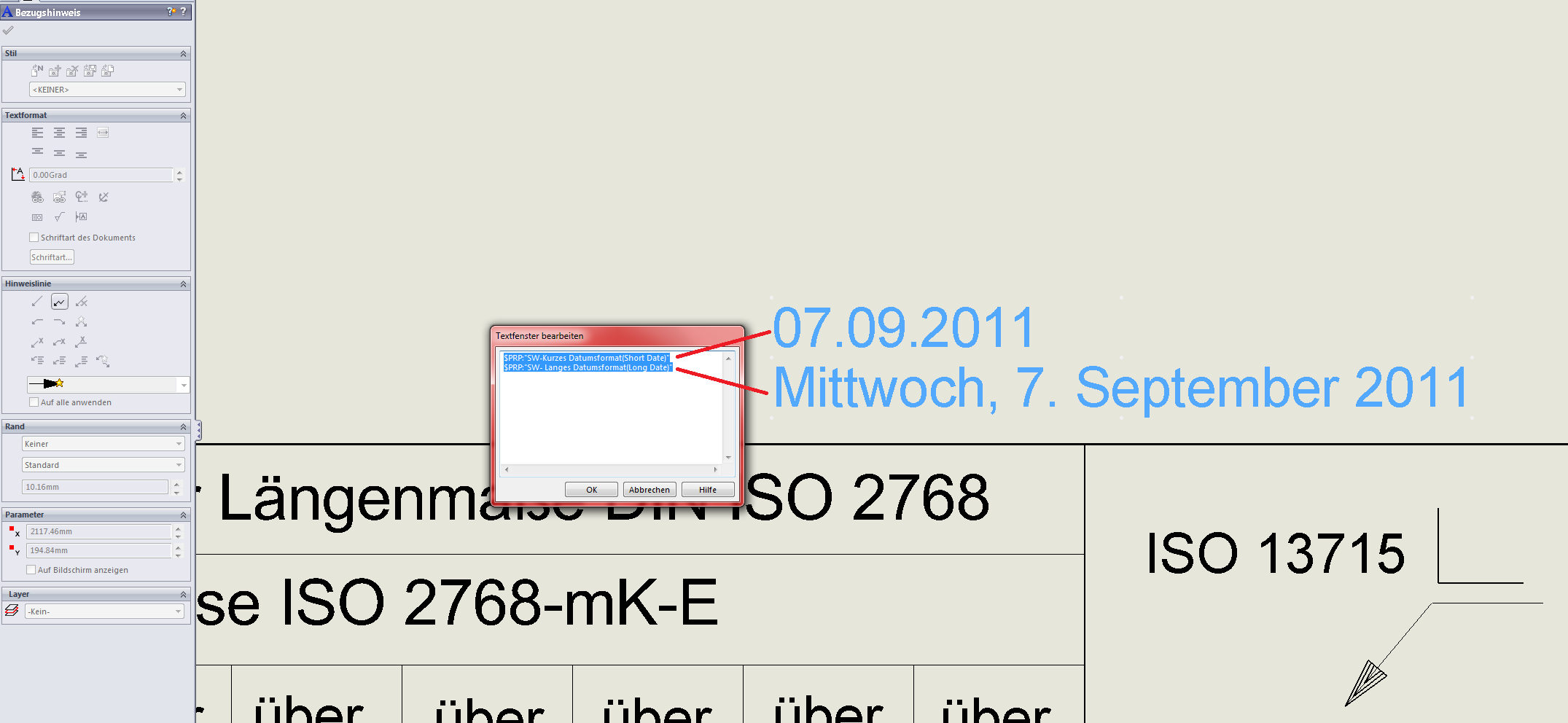 Hallo zusammen, Punkt 1: Datum automatisch anpassen - ganz schlechte Idee. Das wird ja nicht aus Kux und Dollerei darein geschrieben, sondern aus Zwecken der Dokumentation. Und willst du wirklich, dass da automatisch aktualisiert wird, wenn sich jemand die Zeichnung öffnet und z.B. druckt? Oder das sich das Datum ändert, weil das jemand in einer neuen Version aufruft und dann speichert, weil es aktualisiert wurde? In meinen Augen gehört das in eine Dateieigenschaft, in der der verantwortliche Zeichner und/oder Konstrukteur das Datum eingibt, das richtig und relevant ist. Das führt dann auch zu Punkt 2 @Leo: beim Einfügen der Beschriftungen und Verknüpfung zu den Eigenschaften kannst du bei den Datumsdingern unten in einer Dropdownliste zwischen langen und kurzem Datumsformat wählen und mit/ohne Zeit anhaken. Ein benutzerdefiniertes Datumsformat gibt es aber nicht, das kurze ist TT.MM.JJJJ Da ich aber wie oben beschrieben nie die automatischen Datumsangaben für's Schriftfeld nehmen würde kann ich in eine Dateieigenschaft das Datum ja so reinschreiben, wie ich das möchte, also z.B. 07.SEP 11 oder andere kreative Schreibweisen  Ciao, Stefan ------------------ Inoffizielle deutsche SolidWorks Hilfeseite http://solidworks.cad.de Stefans SolidWorks Blog Eine Antwort auf diesen Beitrag verfassen (mit Zitat/Zitat des Beitrags) IP |