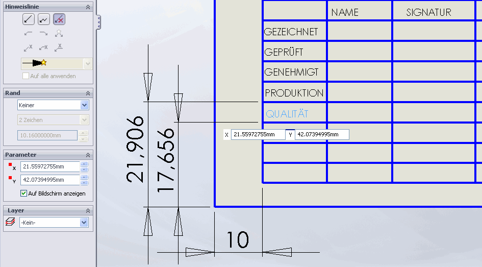 ich vermute, das der blattmaßstab 2:1 oder 1:2 eingestellt ist, ein umstellen auf 1:1 könnte abhilfe schaffen eine vermutung von mir ist, das die schriftgröße immer 1:1 ist und dadurch vielleicht auch die textposition 1:1 ist (der text soll ja 3mm gross sein und nicht mit dem maßstab skaliert werden) bei linien, wird aber der blattmaßstab mitgerechnet (bei skizzen wollen wir ja den berücksichtigt haben) habs jetzt aber nicht getestet, das überlasse ich dir  lg martin ------------------ Bin jetzt auch unter Skype erreichbar , einfach nach Martin Doppler in Wien suchen. Eine Antwort auf diesen Beitrag verfassen (mit Zitat/Zitat des Beitrags) IP |