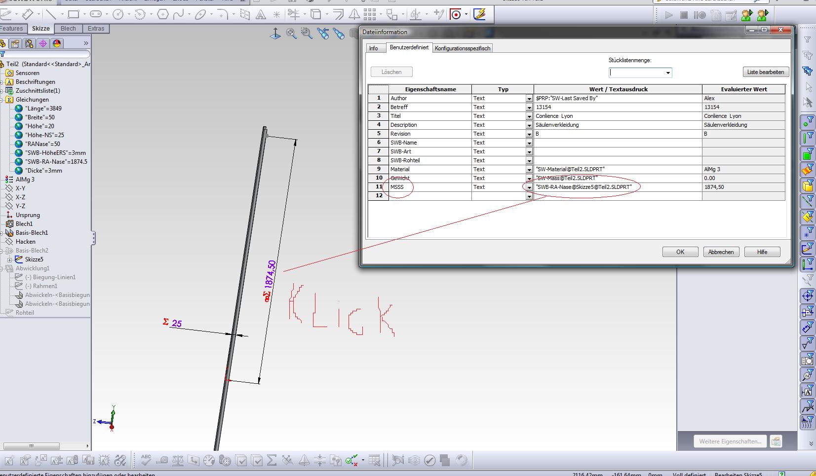 JA das ist möglich. Du muss aber beachten wie den Wert später weiterverwenden willst. Für Zeichnung oder andere Beschriftungen sind die Eigenschaften besser Für Gleichungen ist besser an eine globale Variable zu binden. Übertragen von Bemaßungen: 1--> einfach die Skizze öffnen wo das Maß sich befindet 2--> dann Bbenutzereigenschaften öffnen, so dass Du auch das Maß noch sehen kannst. 3--> Variablenbezeichnung eingeben 4--> Verknüpfungsfeld anwählen und auf das Maß klicken. Eine Antwort auf diesen Beitrag verfassen (mit Zitat/Zitat des Beitrags) IP |