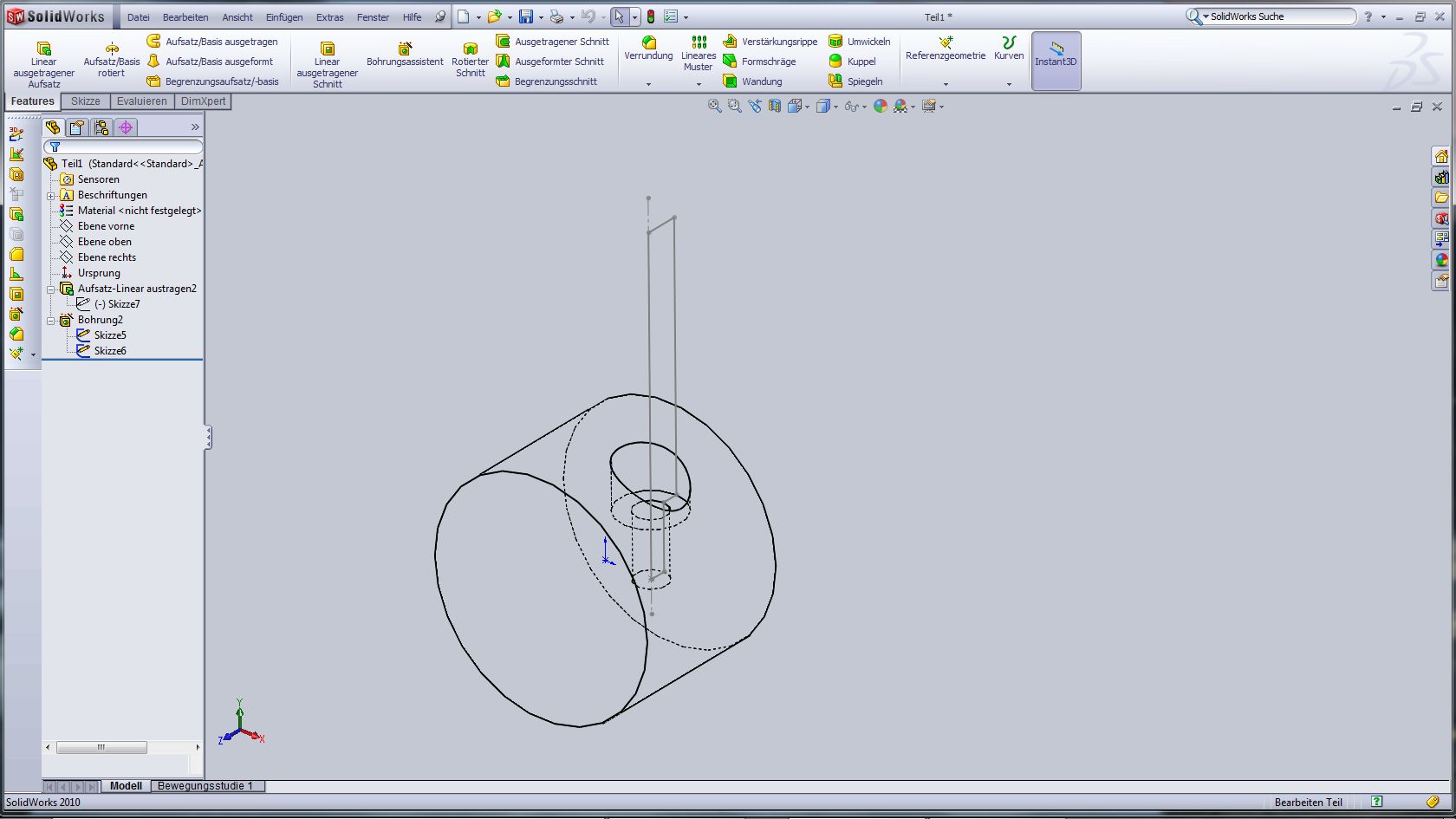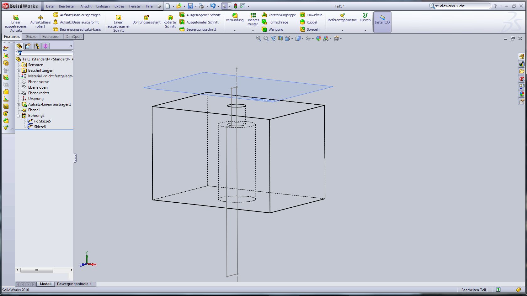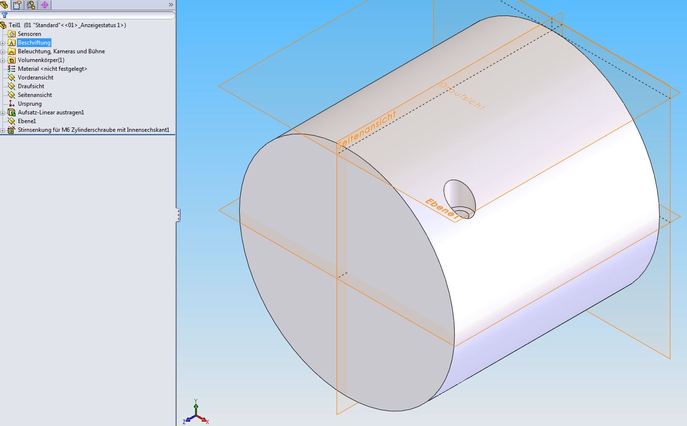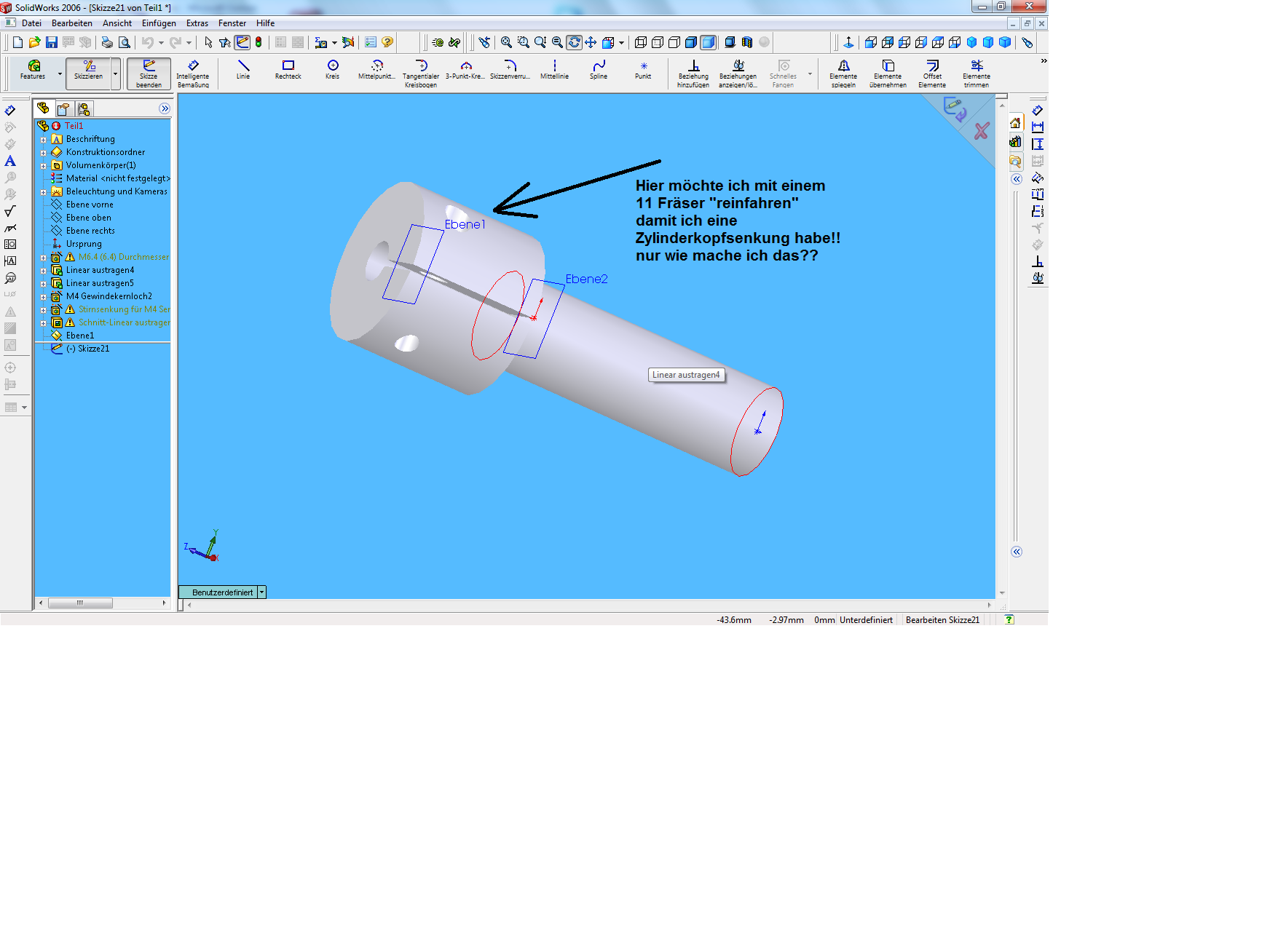 Eine Ebene erstellen in dem Abstand zu "Ebene oben", da wo die Auflagefläche der Schraube hinsoll. Auf dieser neuen Ebene eine Skizze anfangen. In der Skizze Halbkreis und "Fräser-Einlauf" einzeichnen. Aus der Skizze einen linear ausgetragenen Schnitt. Gruß, Torsten BTW : Herzlich Willkommen auf CAD.de Eine Antwort auf diesen Beitrag verfassen (mit Zitat/Zitat des Beitrags) IP |