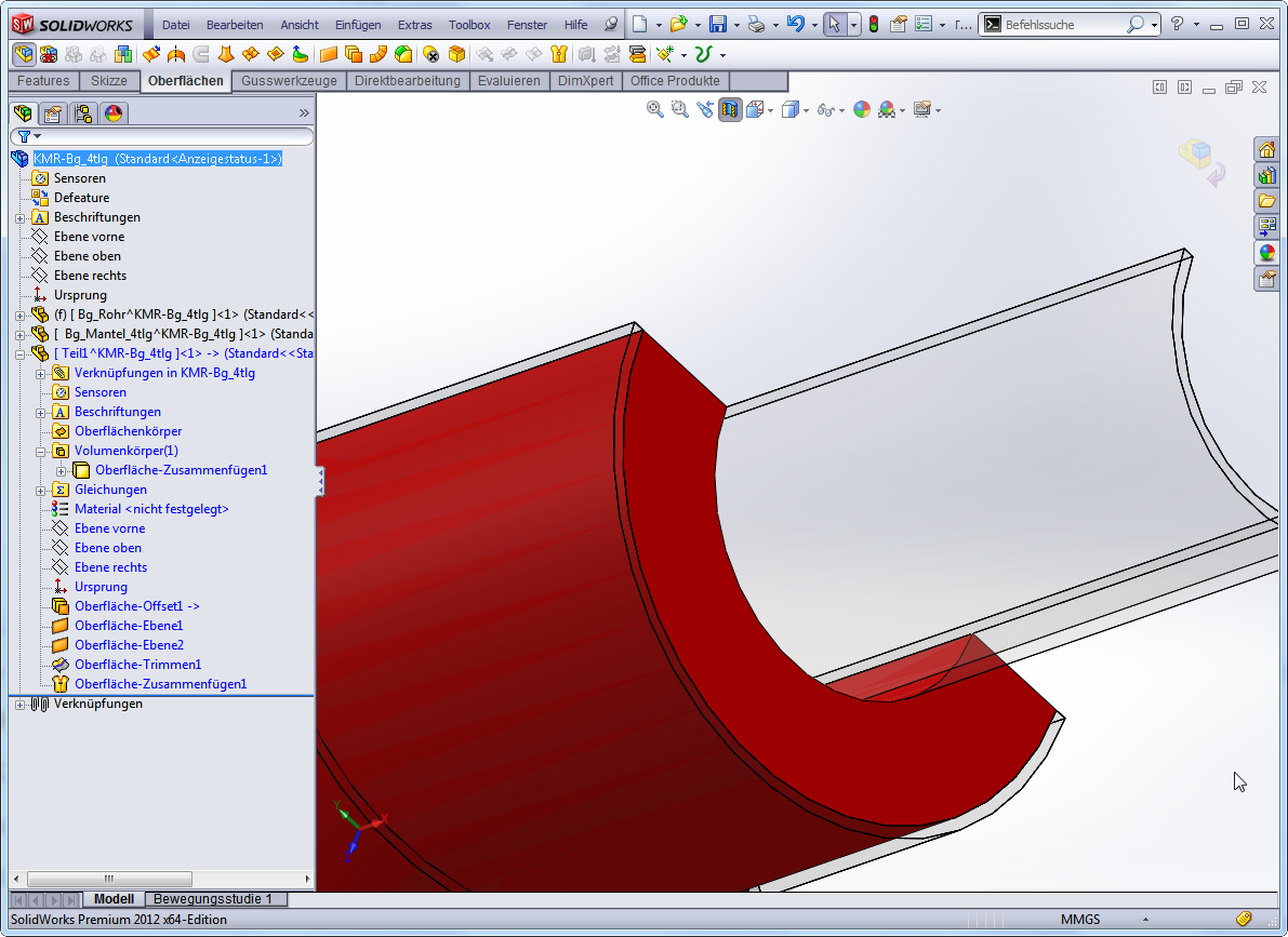 - Mit Oberflächenfeatures (planere Fläche, trimmen, verbinden und Volumen erzeugen) den gewünschten Bereich erzeugen