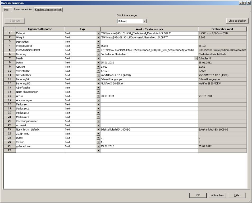 Bei Blechteilen geben wir zusätzliche Informationen in den Benutzerdefinierten Eigenschaften an (Abwicklungsabmaße)