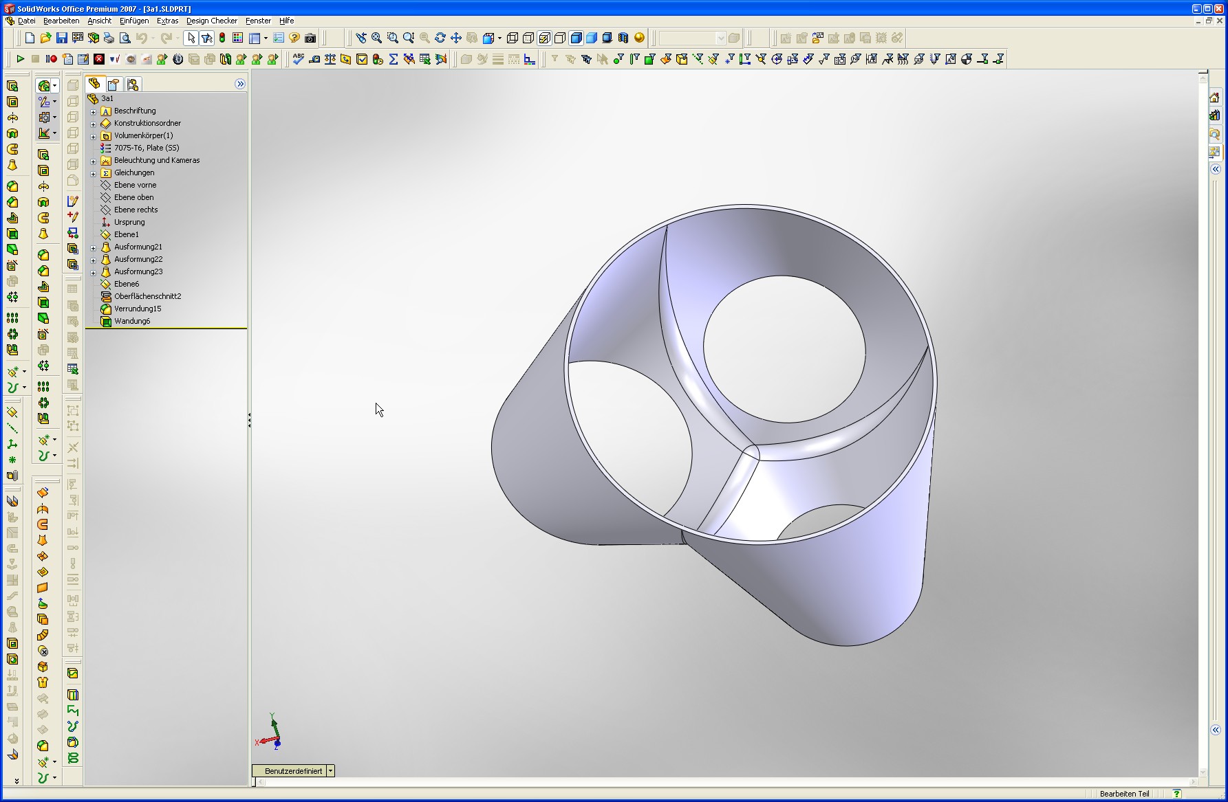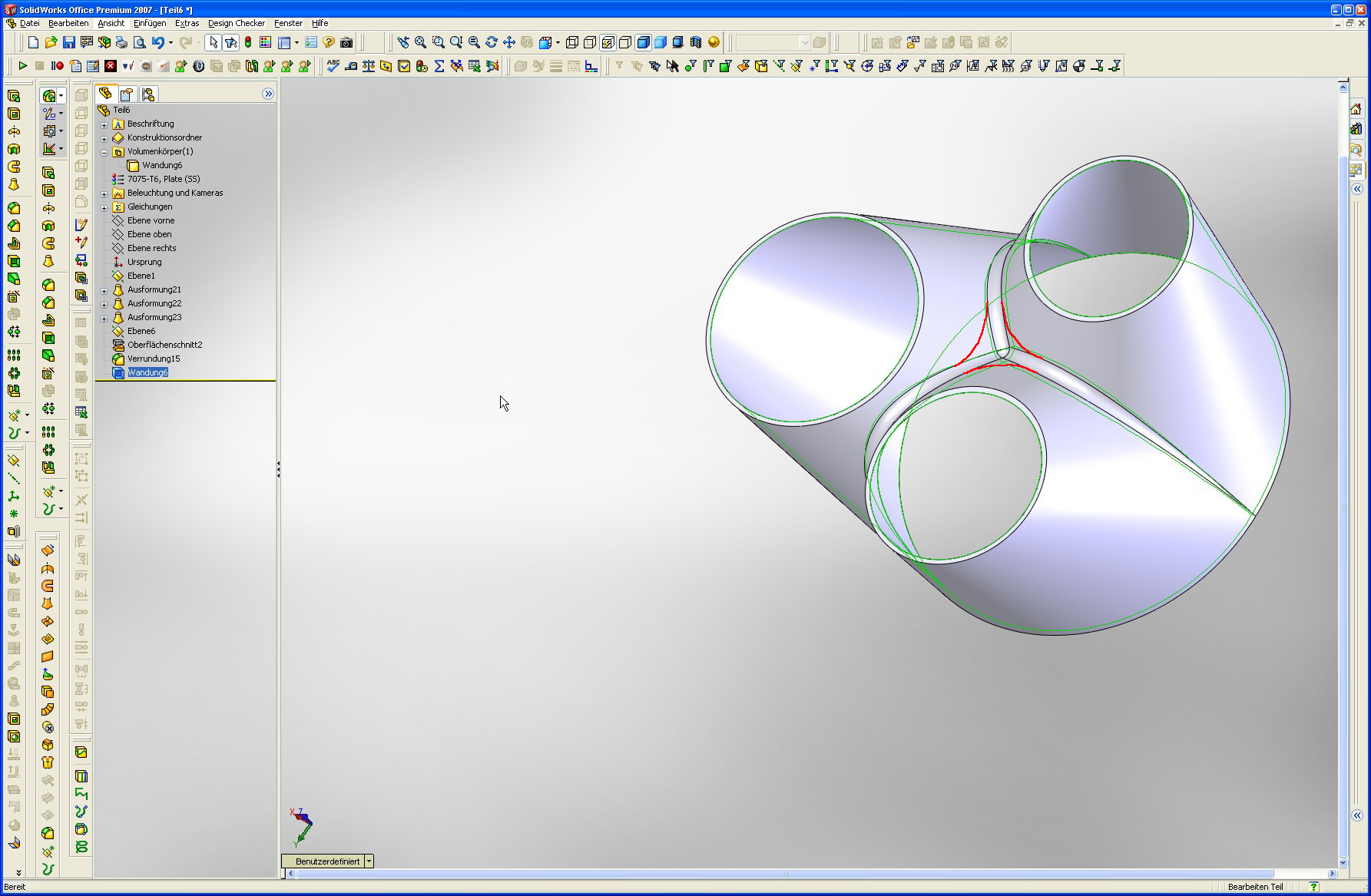 Ein Beispielhafter Versuch, 3 einzelne Körper auszuformen und nachträglich ordentlich zu verrunden hat mich leider nicht weitergebracht, da ich keine Lösung finden konnte, die "Ecke" sauber zu verrunden, an der sich quasi die 3 Schnittkanten treffen. Auch der Versuch eine Verbindungsfläche zu erzeugen, die tangential auf die ganzen angrenzenden Ausformungen stößt hat kein verwendbares Ergebnis geliefert.