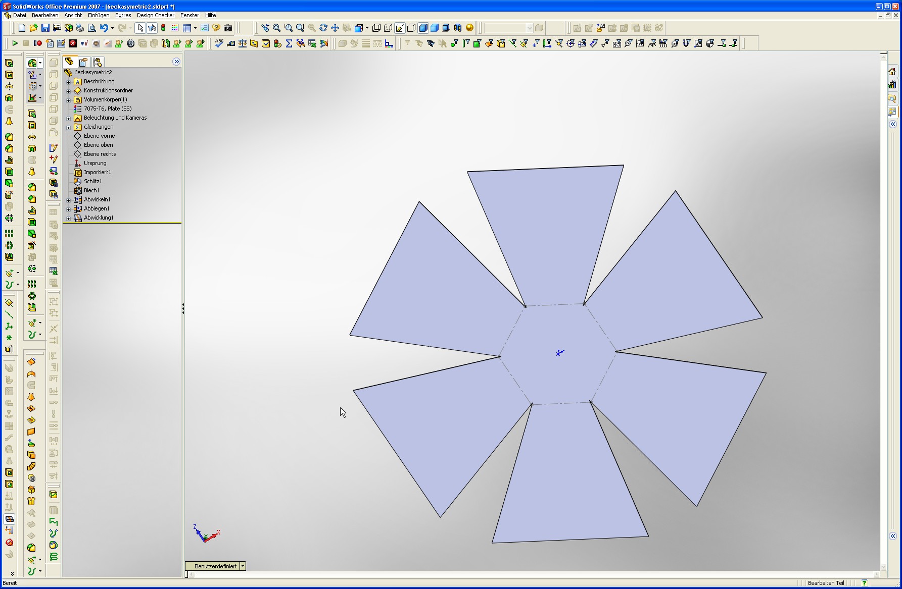 Hallo Leute Steh vor einem Problem und zwar.... Ich habe mir ein Teil gezeichnet welches später so zusammen geschweisst wird. Nun brauch ich aber nicht diesen Zustand sondern die Geometrie wenn es Flach ist, woraus ich eine DXF Datei erzeugen kann was wiederum der Laser braucht um es zu Lasern. Ich hoffe ich hab es nicht zu kompliziert erklärt. Kann mir jemand behilflich sein und erklären wie ich dies am besten bewerkstellige ? tausend Dank im voraus.