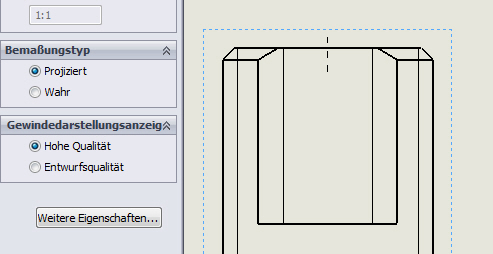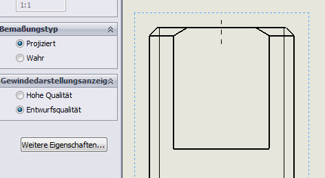 Das ist aber erst ab der 2011-er Version so. Getestet mit 2010 ist die Ansicht identisch. Allerdings hat SWX ja recht. Denn an dieser Stelle tritt das Gewinde aus der Fläche aus. Aber nach Norm ist die Darstellung allerdings nicht. (Zumindet nicht in D ) ------------------ Grüße aus dem Schwabenland Dieter  Eine Antwort auf diesen Beitrag verfassen (mit Zitat/Zitat des Beitrags) IP |