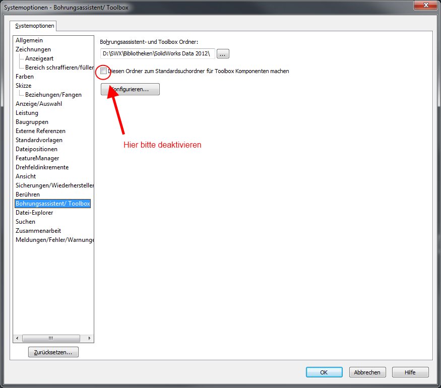 Hast du denn die von mir gezeigte Option geändert? Gut wäre auch noch, veränderten Teilen der Toolbox das interne Toolbox-Flag weg zu nehmen. Dazu das Tool sldsetdocprop.exe aus dem Verzeichnis C:\Program Files\SolidWorks Corp 2012\SolidWorks\Toolbox\data utilities verwenden. ------------------ Einen schönen Gruß von Heiko Eine Antwort auf diesen Beitrag verfassen (mit Zitat/Zitat des Beitrags) IP |