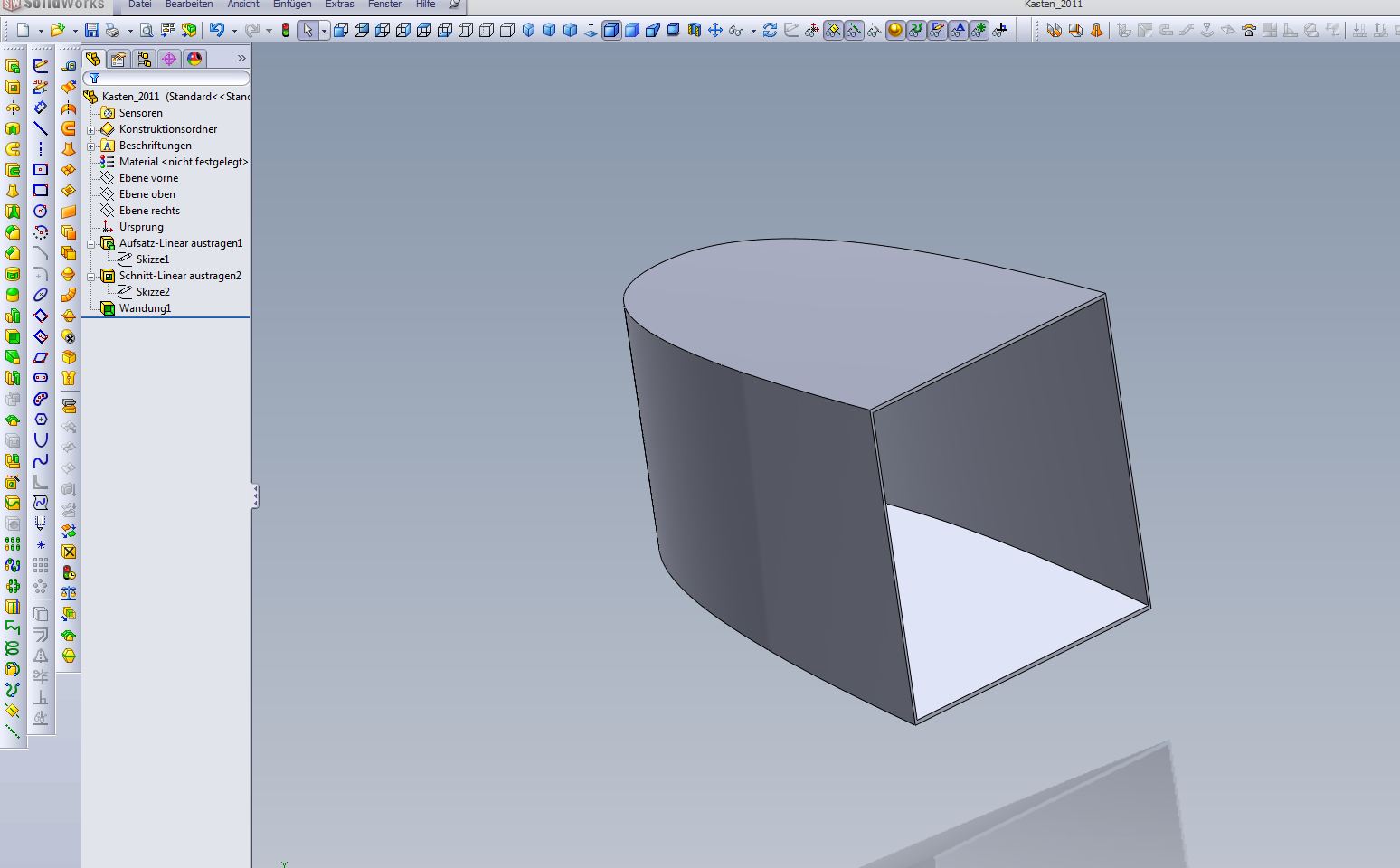 Hallo schottric, warum nicht einfach aus vollem Volumen modelliert , zurechtgeschnitten und dann Wandung benutzt Grüße Andreas