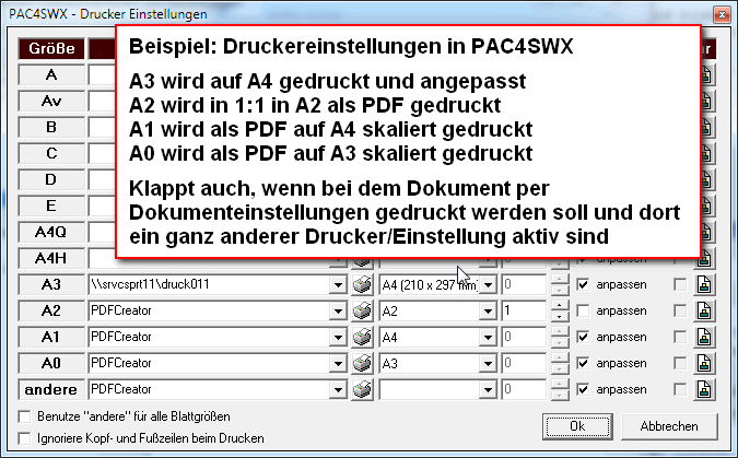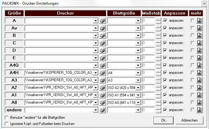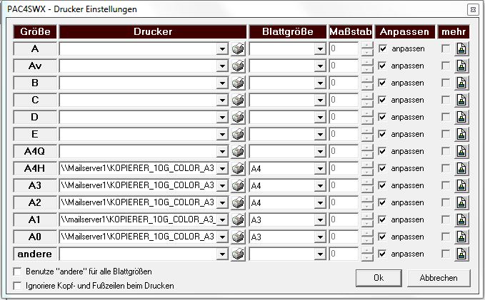 Guten Morgen Stefan, hier nun die Screenshots. Das Problem ist, wenn wir 100 Zeichnungen ausdrucken, sind ca. 20 - 30% in der falschen Größe. Alle Zeichnungen die größer als A4 sind kommen kreuz und quer in allen verschiedenen Größen raus. A0 auf A4, A1 auf A3 usw. Je nachdem wie sie gespeichert wurden. Das Laden der verschiedenen Konfigurationen muss auch oft mehrmals durchgeführt werden, bis die richtigen Drucker eingetragen sind. Die Konfigurationsdateien liegen auf dem Server. Alle Drucker sind verfügbar und können auch gewechselt werden. Dieses Problem besteht erst seit Win 7.