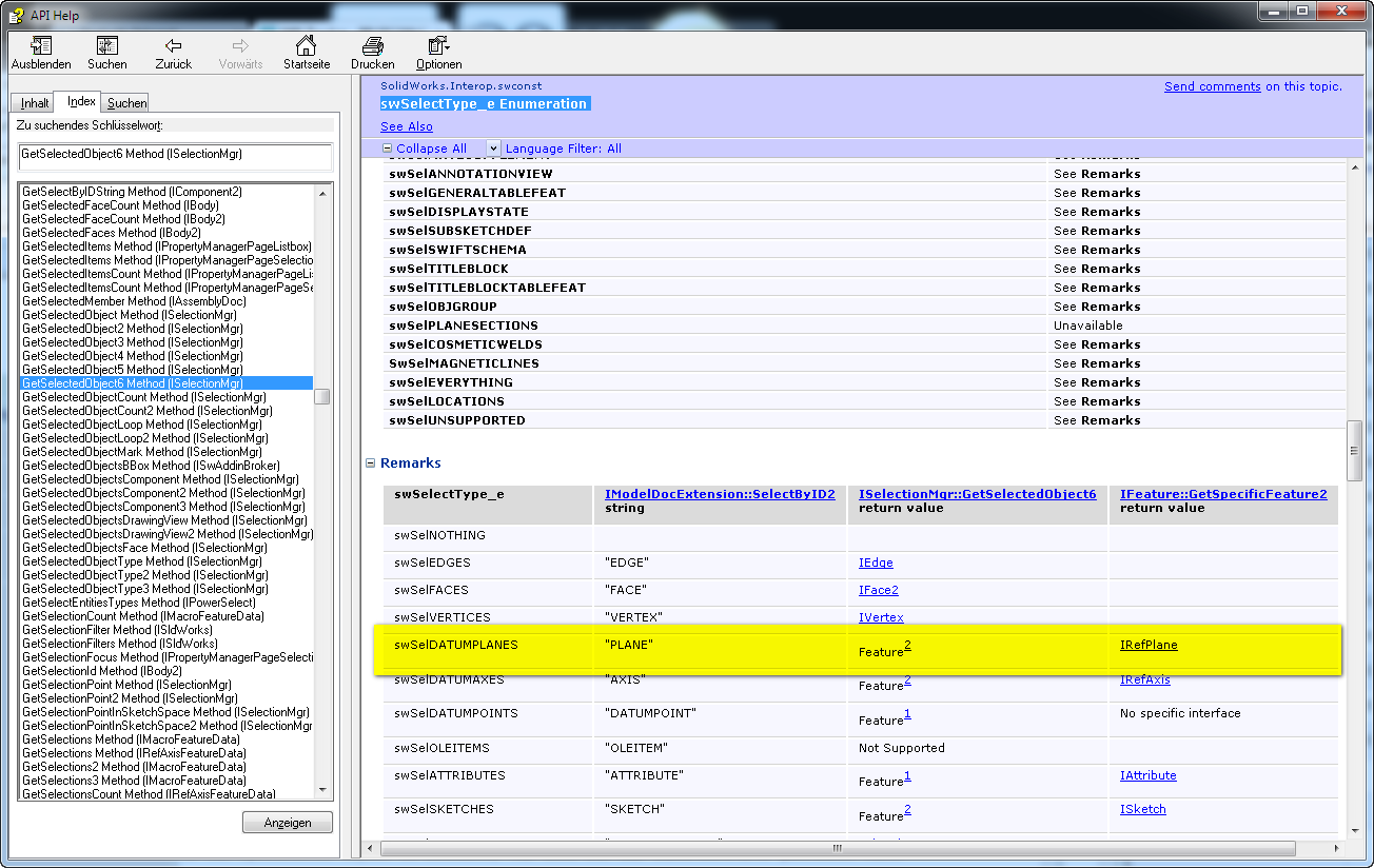 Jein, das GetSelectedObject6 gibt dir zwar das selektierte Objekt zurück, dass kann aber je nach Selektionskriterium ein spezifisches oder ein mehr allgemeines Objekt sein. Was du genau zurückbekommst findest du in der API Hilfe. Bei GetSelectedObject6 steht unter Remarks (die man unbedingt immer bei allen API Befehlen lesen sollte), dass du ein Objekt zurückbekommst, wie es in der swSelectType_e Enumeration festgelegt ist. Einen kurzen Klick darauf und runterscrollen zu den remarks ( ! ) zeigt, dass bei deinem Selektionskriterium "PLANE" das GetSelectedObject6 ein Objekt vom allgemeinen Typ Feature zurückgibt; bei der Bemerkung der Bemerkung steht dann wieder der Hinweis auf GetSpecificFeature2, um das spezifische Objekt zu bekommen, was eben für das InsertNewPart2 gebraucht wird. Ich hoffe, ich hab das nicht zu hinterrum erklärt und du verstehst, wie es gedacht ist  Ciao, Stefan PS: die API Hilfe ist dein Freund und eine wirklich gute Infoquelle, wenn man sich erst mal an den Aufbau gewöhnt hat ... ------------------ Inoffizielle deutsche SolidWorks Hilfeseite http://solidworks.cad.de