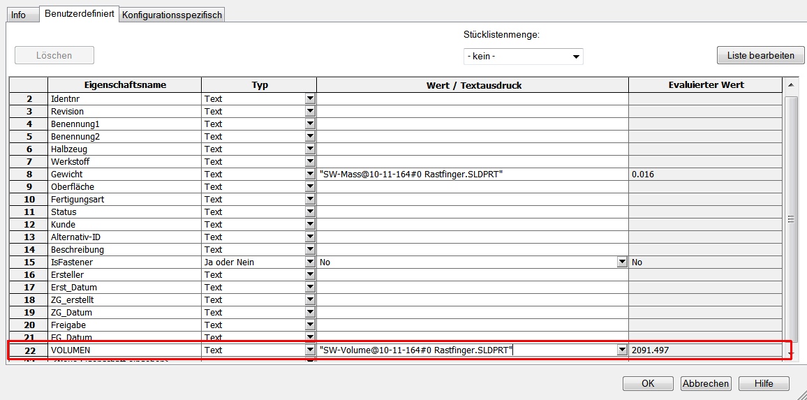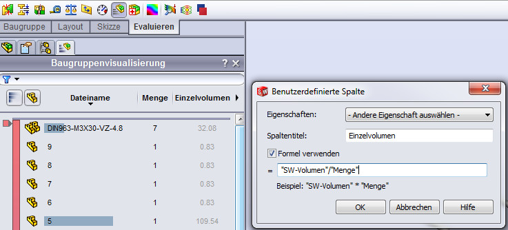 Hallo PEPE. du kannst in den Einzelteileigenschaften das Volumen bereits in eine benutzerdefinierte Eigenschaft eintragen (hier im Screenshot mal VOLUMEN genannt ) Wenn du dann in der BG-Stückliste dir dieses Feld anzeigen lässt, dann kommst du auch mit SWX -Bordmitteln zum Erfolg... ------------------ ========== Gruß Andreas ========== Eine Antwort auf diesen Beitrag verfassen (mit Zitat/Zitat des Beitrags) IP |