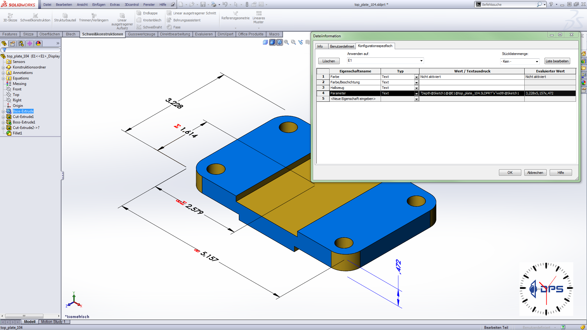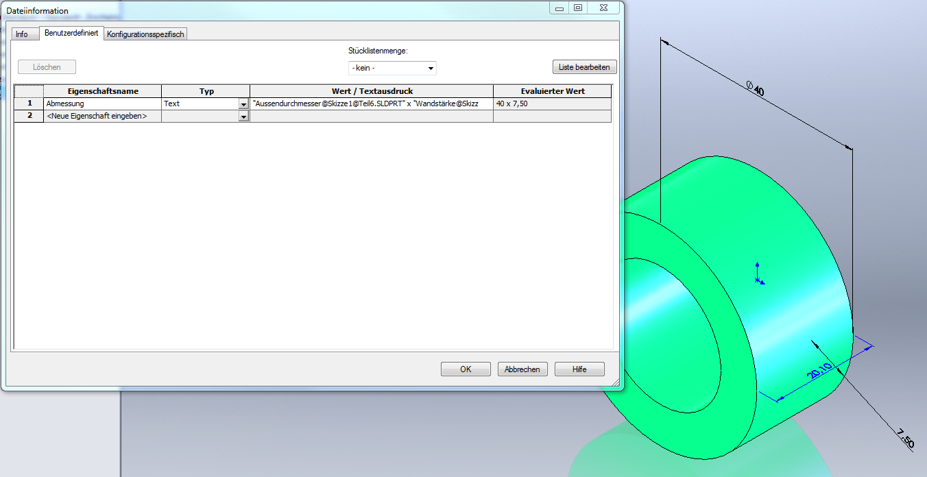 Wenn ich Deine Frage richtig verstanden habe, dann wäre mein Vorschlag folgender: Wenn du diese 3 Parameter in einer Eigenschaft zusammenfasst, dann sollte das gehen. z.B.: 1.blende dir alle Maße ein (RMB auf dem Ordner Beschriftungen) 2.lege eine neue Eigenschaft an (Parameter o.ä.) 3. Klicke auf das jeweilige Maß , dann "x"; dann das nächste Maß...usw. 4.Füge deiner Stückliste eine neue Spalte zu und verlinke diese Spalte auf die neu Eigenschaft. ------------------ CSWST/CSWI/CSWP/ 3DVia
