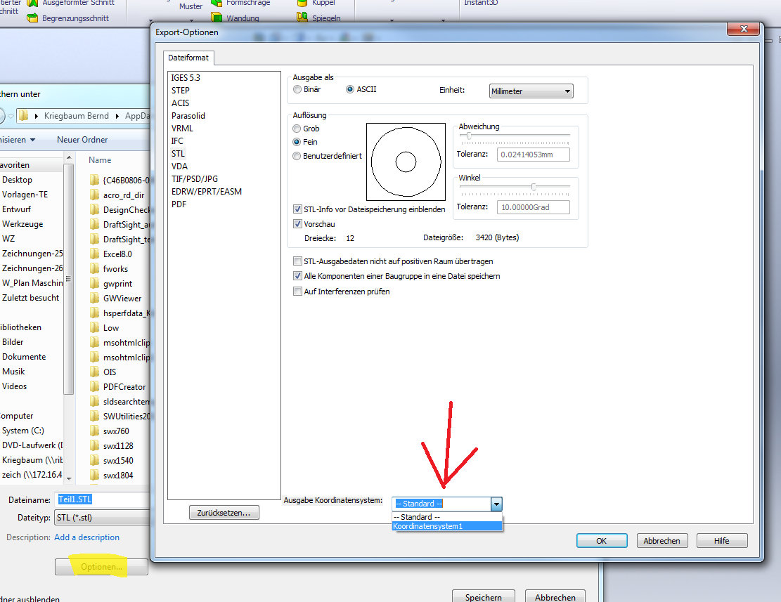 Das Koorodinatensystem findes du unter Referenzgeometrie Koordinatensystem. Diese kannst du dann auch siehe Bild in den Exportoptionen auswählen. Gruß Bernd ------------------ --- Man muß nicht alles wissen, man muß nur wissen wo es steht --- Staatlich anerkannte Deutschniete  Eine Antwort auf diesen Beitrag verfassen (mit Zitat/Zitat des Beitrags) IP |