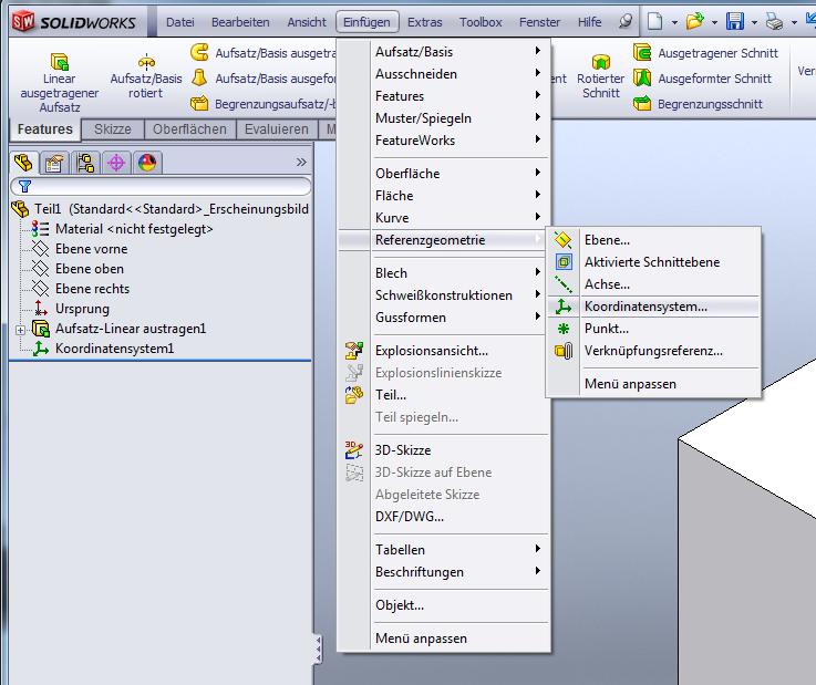 Hallo bnavigator, @neues Koordintaensystem: Zu finden unter Referenzgeometrie/Koordintaensystem dort gibts du dann für die XYZ-Achsen jeweils die dementsprechende Kante an. Vorteil ist das dann das Koordinatensystem auch wirklich gedreht ist. Eine andere Möglichkeit gibt es auch noch: Die Neuausrichtung der Standardebenen: 1. Ausrichtugnsfenster öffnen(mit Leertaste) 2. Ausrichtungsfenster mit der Nadel festpinnen 3. Neue Vorderansicht deines Modells auswählen + mit STRG Taste die Oberseite bestimmen(Jetzt sollten zwei Flächen ausgewählt sein) 4. Auf Eintrag "Normal auf" doppelklicken 5. Eintrag "Vorderseite" einmal anklicken 6. Nun auf das zweite Symbol(= Fernrohr) von links klicken 7. Bestätigen INFO: Allerdings kann dies durch Drücken der dritten Taste von links wieder rückgängig gemacht werden. Und das Koordinatensystem ist nicht neu ausgerichtet! Also Vorsichtig damit umgehen. Weiss aber nicht ob dir das beim 3D-Drucker weiterhilft.... Falls der 3D-Drucker das Koordinatensystem verarbeitet wird vermutlich das Teil wieder anders daliegen.