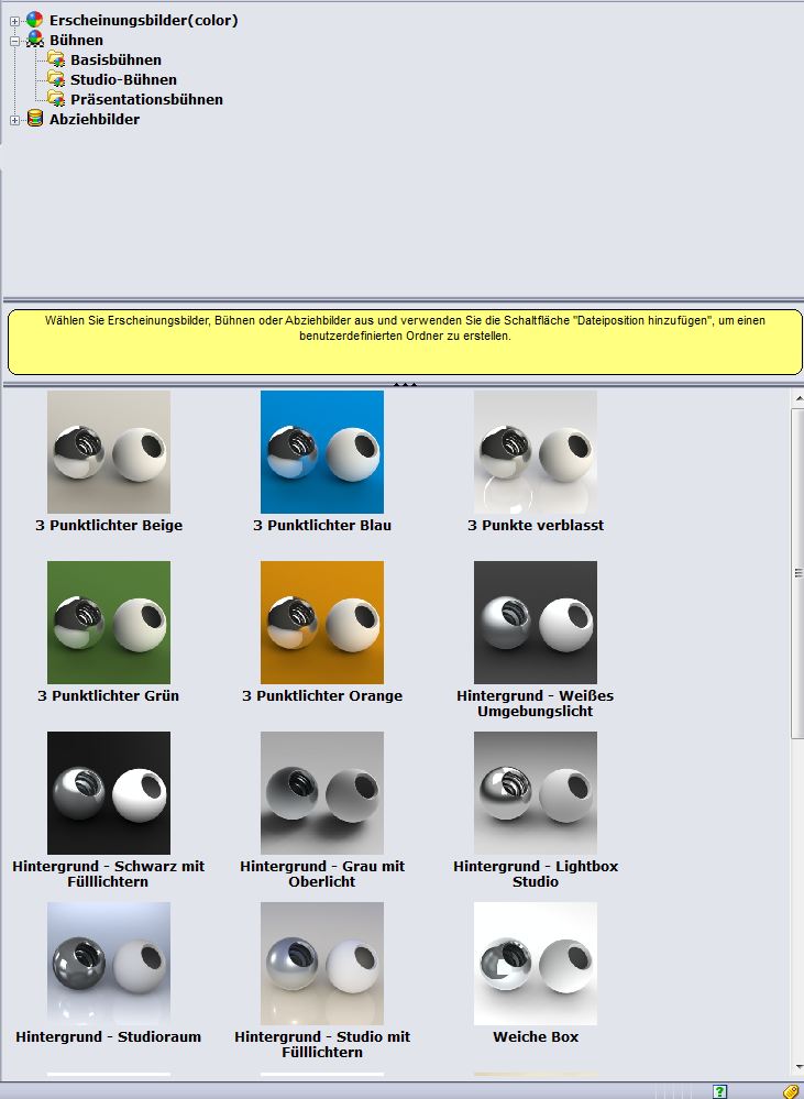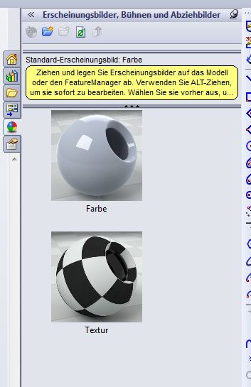 Wo auch immer....\Program Files\SolidWorks Corp\SolidWorks\data\graphics dort sollten die Grafiken liegen. check das mal ab, vlt ist bei der Installation was daneben gegangen. Dort sucht SWX standardmäßig nach "Bildchen" Unter Extras-->Optionen-->Systemoptionen-->Dateipositionen..dort kannst du ach noch einen Pfad für benutzerdefinierte Erscheinungsbilder , Texturen und Bühnen angeben. Im Taskmanager selber kannst du auch noch Dateipositionen hinzufügen, wenn du oben auf das Ordnersymbol klickst. ------------------ CSWST/CSWI/CSWP/ 3DVia