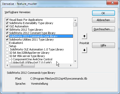 Du kannst natürlich auch statt der einen Konstanten einen Verweis auf die Command type library setzen, ich finde es einfacher die eine Konstante eben in den Code zu schreiben. Eine Übersicht über alle Command-Konstanten kannst du auch bei mir z.B. auf http://solidworks.cad.de/mm_990.htm runterladen, das kann man dann einfach im Editor aufrufen und dort danach suchen. Im VBA-Editor geht es, wenn du den Verweise gesetzt hast und dann auf F2 (Ansicht-Objektkatalog) klickst.Ich hoffe, das hilft dir weiter. Ciao, Stefan ------------------ Inoffizielle deutsche SolidWorks Hilfeseite http://solidworks.cad.de Eine Antwort auf diesen Beitrag verfassen (mit Zitat/Zitat des Beitrags) IP |