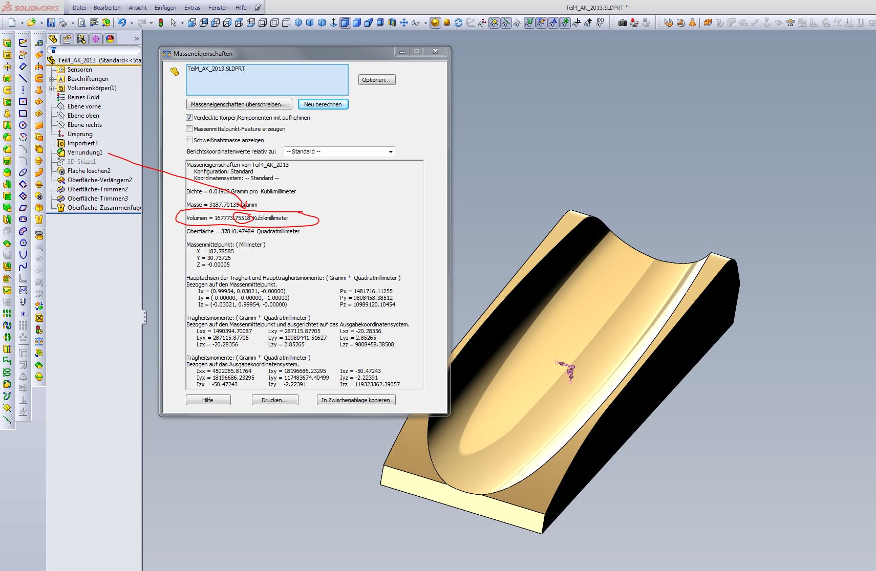 ja, hab ich 167768,07976301 mm³ Torsten 167767,90405273 mm³Andreas Radius oben 167767,90838260 mm³Andreas Radius unten es bleiben je nach Position des Radius ca. 0,175 mm³ Unterschied . Plötzlich bin ich leichter _ ( was ja auch der Realität entspricht ) SCNR Grüße Andreas