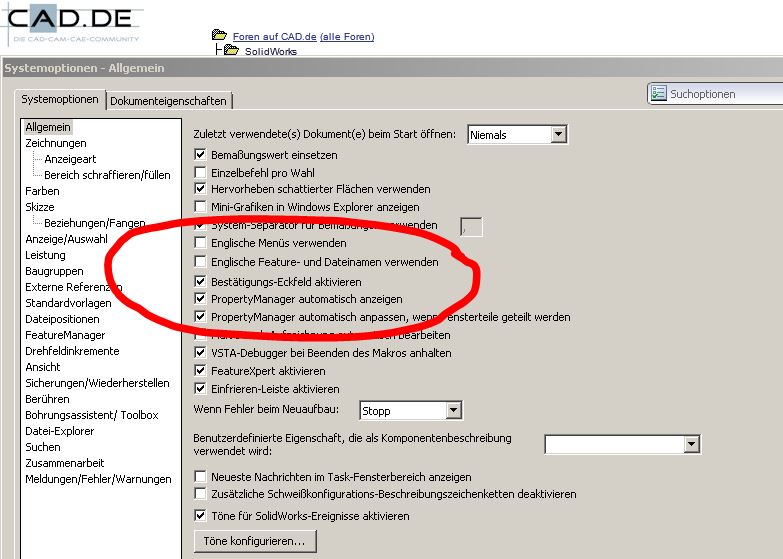 Hallo! Ich habe die Suche schon bemüht, weiß aber, ehrlich gesagt, nicht so genau nach was ich suchen muss. Ich habe folgendes Problem: Wenn ich im Skizzenmodus bin sind in der oberen rechten Ecke die Symbole zum bestätigen und Abbrechen weg. Von den Kollegen wusste leider auch niemand rat. Momentan beende ich Skizzen immer mit Neuaufbau (strg+q). Wie kann ich mir die Symbole wieder holen? Eine Antwort auf diesen Beitrag verfassen (mit Zitat/Zitat des Beitrags) IP |