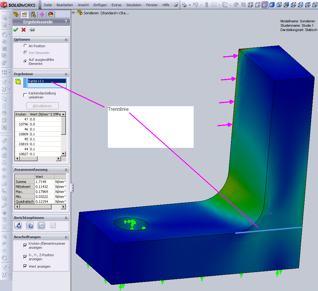 Mit Trennlinie kannst Du auch eine Schnittebene erzeugen und dann die Reaktionskräfte anzeigen lassen und das dann im nächsten Durchgang rechnen.