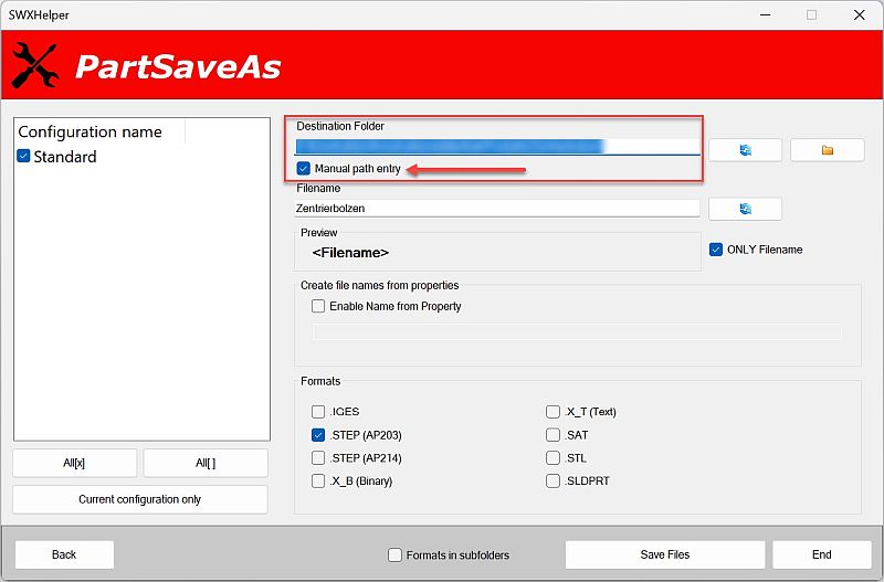 Den Änderungswunsch von swx-cad-nutzer wurde in diesem Release ebenfalls umgesetzt. Durch aktivieren der Checkbox die der Pfad editierbar und der Pfad aus dem WindowsExplorer kann eingefügt werden. Im Hintergrund sind zahlreiche Abfragen hinzu gekommen, um sicherzustellen das der eingefügte Pfad(Text) auch valide ist. Zum original Post: https://swxtools.de/release-swxhelper-update-1-0-3-7/
