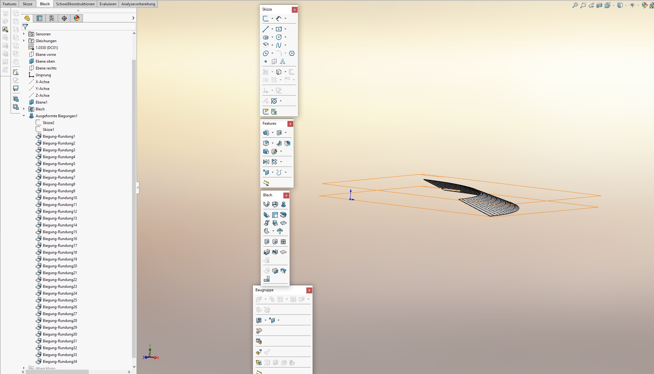 Zitat: Original erstellt von Heiko Soehnholz: N'Abend,du machst bitte folgendes: - Erstelle eine erste 3D-Skizze und übernehme eine der oberen Kante mit Elemente übernehmen - Schließe die Skizze und erstelle eine zweite 3D-SKizze - Übernehme nun die passende untere Kante - Nachdem du diese Skizze auch geschlossen hast, blendest du den bisherigen Körper aus, oder Löschst ihn - Verwende Ausgeformte Biegung, um dein Blechteil zu modellieren voila Beim nächsten derartigen Blechteil mach du am besten die Skizzen gleich anders und kannst direkt loslegen.