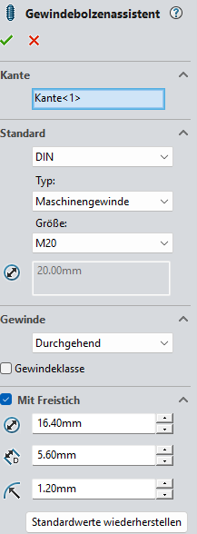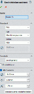 Hallo, ich habe mal eine Frage. Ich möchte auf einer Welle mit dem Gewindebolzenassistent ein Außengewinde erstellen. Der Typ ist auf Maschinengewinde (DIN) eingestellt. Leider werden nur Feingewinde angezeigt. Wie kann ich mir die Regelgewinde einblenden lassen. Gruß Benno