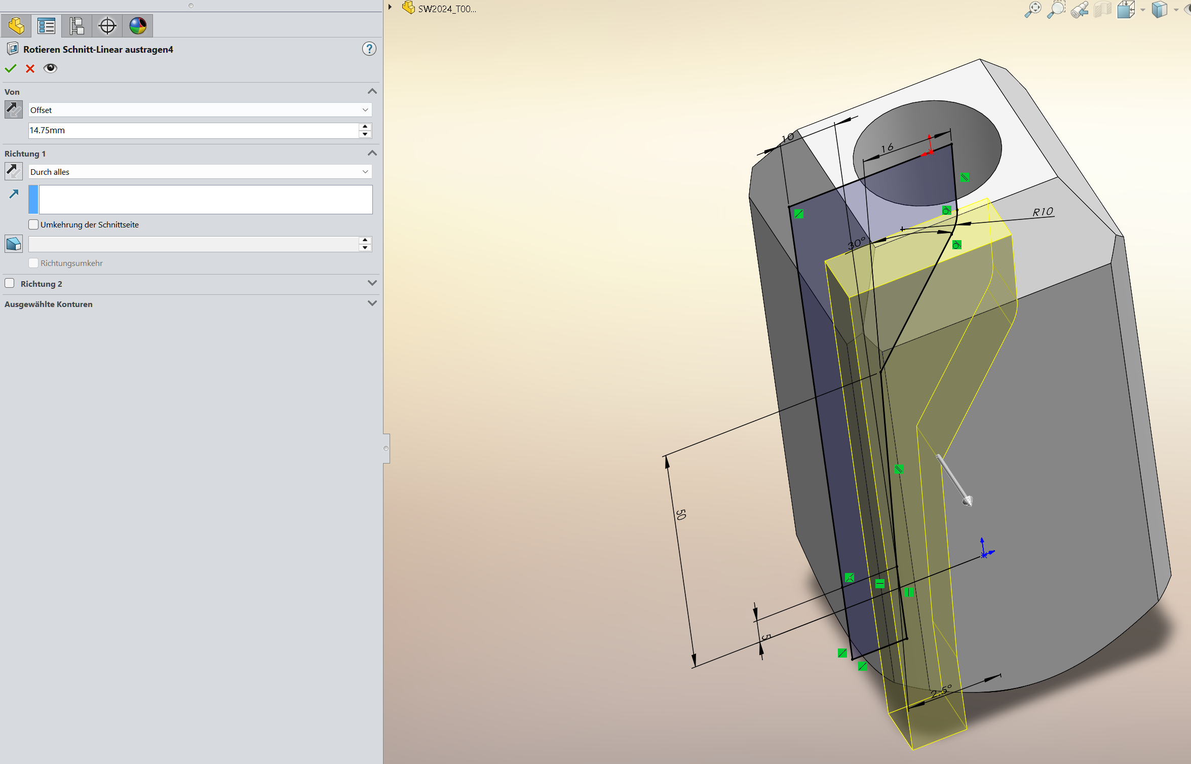 Zitat: Original erstellt von wolschmi: Hallo,definiere den ersten Schnitt den du Mustern willst nicht auf den Eckpunkt sondern mit Offset wie im Bild und alles funktioniert. Muster oder Spiegeln von Features deren Skizzen nicht auf der tatsächlichen Modellgeometrie liegen sondern durch geometrische Beziehungen darauf projiziert werden kann zu Problemen führen. Hoffe du kannst das Teil öffnen, wurde als SW2024 aus SW2025 gespeichert. Gruß Wolfgang