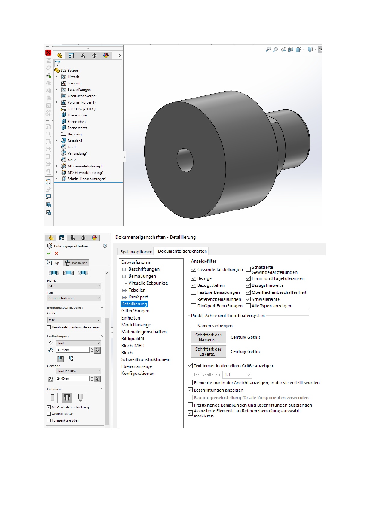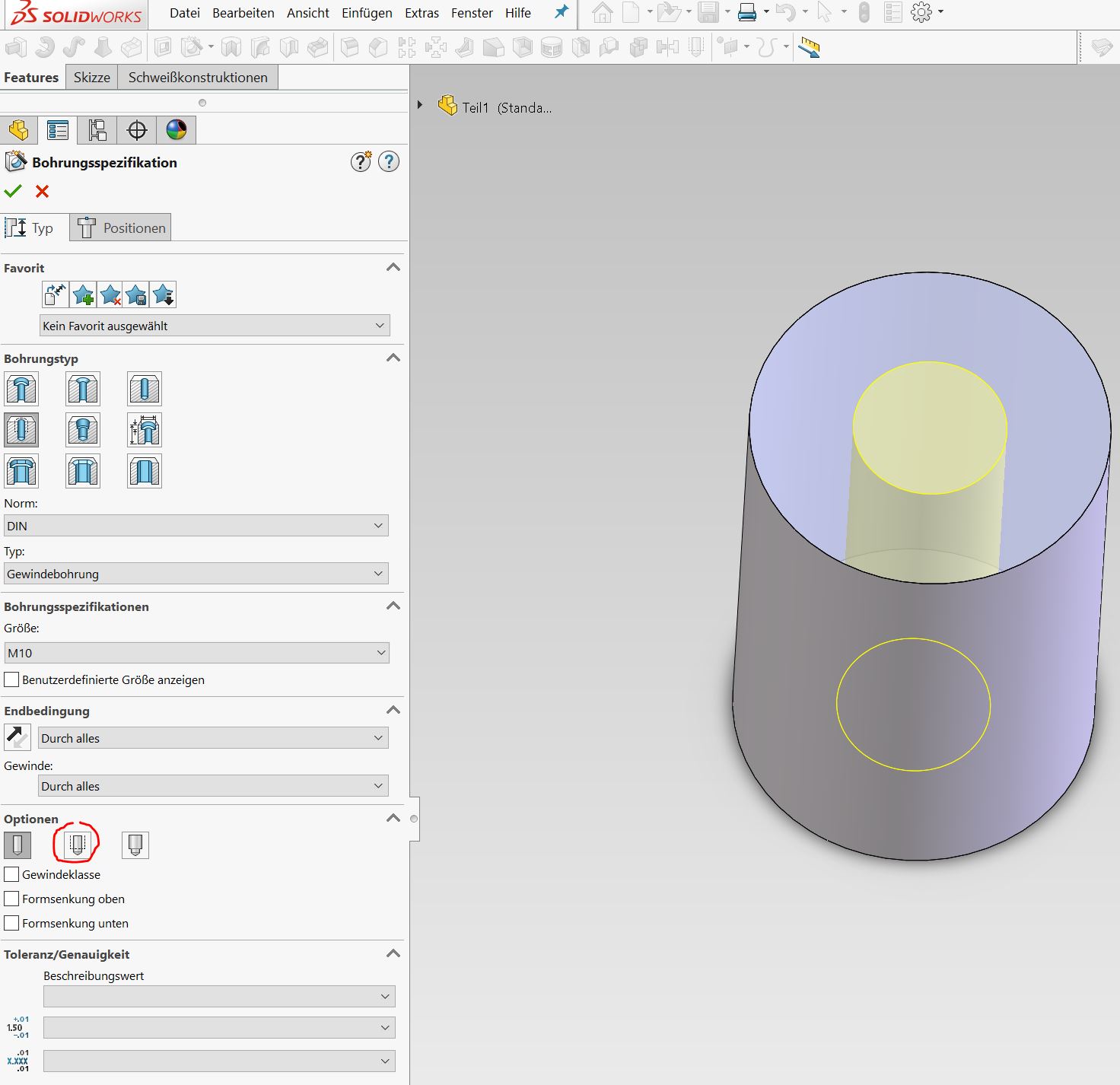 Hallo Holger, wenn das Problem bei meu erstellten Gewinden auftritt, kommt es vom Bohrungsfeature, siehe Bild. edit: ich sehe gerade, dass die Einstellung passen sollte, nach deinem Bild, kannst du nachsehen, ob in dem abgebildeten Teil, das Gewinde Feature nicht unterdrückt ist. Irgendwann hatte ich mal das Problem, dass die Gewinde im Bohtungsfeature plötzlich unterdrückt waren. LG Martin
