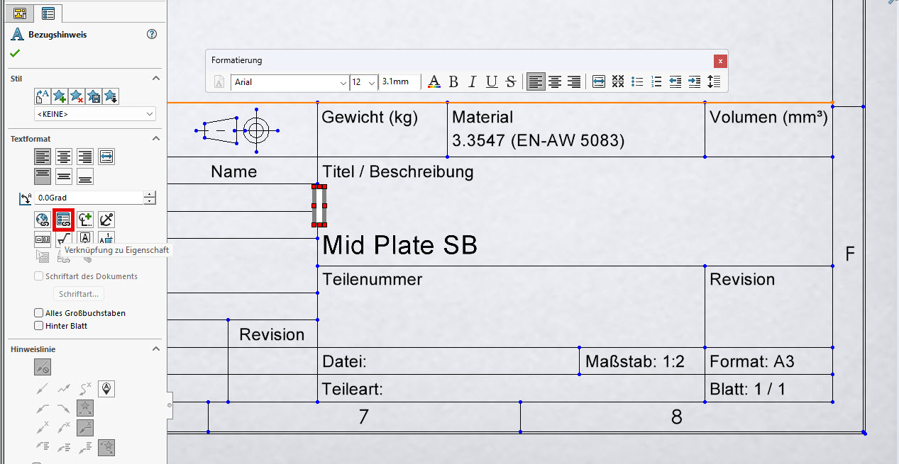 Moin, einfach in der Zeichnung das Blattformat bearbeiten, eine Beschriftung wählen oder neu hinzufügen, und dann mit der Eigenschaft füllen. Danach das Blattformat verlassen und zur Wiederverwendung abspeichern. ------------------ Einen schönen Gruß von Heiko Eine Antwort auf diesen Beitrag verfassen (mit Zitat/Zitat des Beitrags) IP |