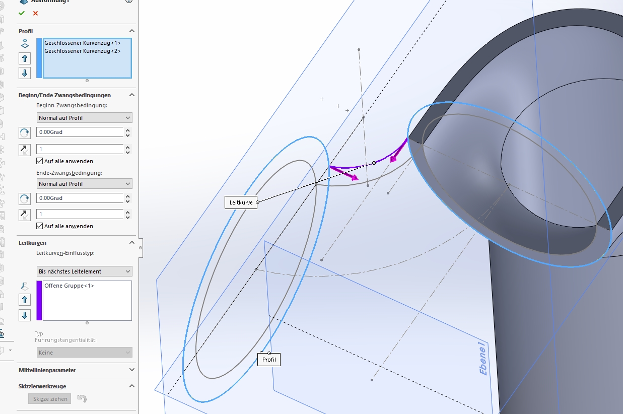 Also ich bin schon etwas schockiert nach 26 Jahren mit SWX  , dass das nicht funktioniert, einen Rohrquerschnitt 1 auf Querschnitt 2 auszuformen in einem Schritt. Ich hab jetzt das "Massivteil" =aussen ausgeformt, "normal auf Profil" mit Leitkurve, dann einen ausgetragenen Schnitt innen gemacht "normal auf Profil" OHNE Leitkurve , die nimmt er nicht. Das hat aber am Innen- und Aussenradius einen falschen Wandstärkenverlauf zur Folge Kann das echt sein? Beim Austragungsschnitt meckert SWX die innenliegende Kurve an als "ungültig". Darf als Leitkurve in der entsprechenden Skizze nur EINE Linie vorhanden sein in der SKizze? Bei den Profilen stammen die Kreise auch aus einer Skizze mit mehreren Elementen. Eine Antwort auf diesen Beitrag verfassen (mit Zitat/Zitat des Beitrags) IP |