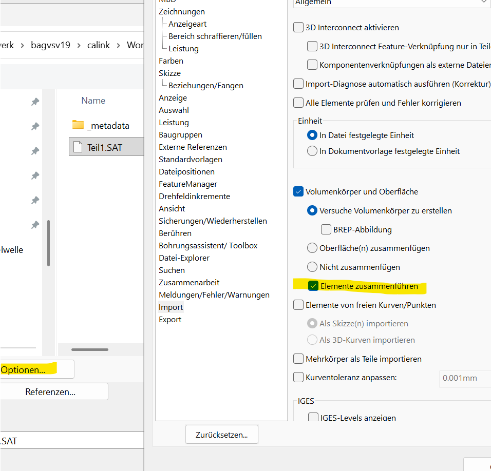 Wenn man schon einen Umweg machen will...dann über FreeCAD. Das kann STEP Daten besser einlesen und exportieren... Da hab ich schon so manche (in SWX fehlerhaft) eingelesene Datei "kleiner" als Step exportiert bekommen...und dann fehlerfrei in SWX hinein... Da geht auch noch anderes...(siehe angehängte zip)  HTH, Ralf ------------------