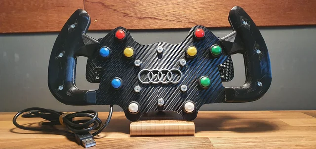 Jemand versucht in einem DIY-Projekt ein Lenkrad für Sim-Racing zu bauen. Dafür bekommt er u.a. eine Carbonplatte als Radkranz und Druckdateien für die Griffschalen.