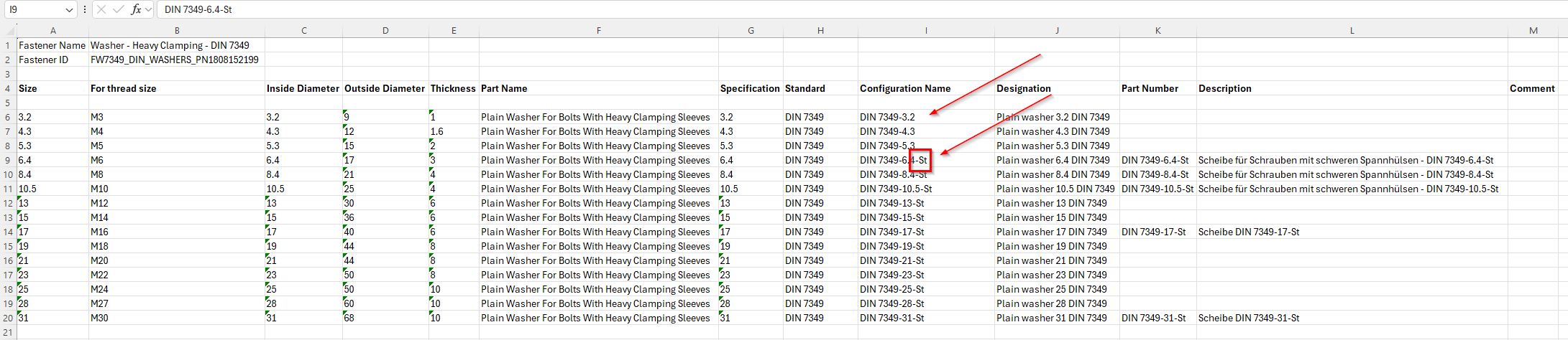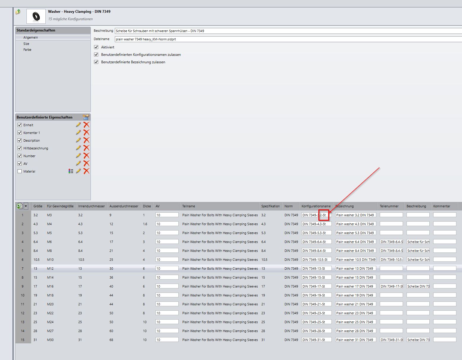Was hier in der Spalte Konfigurationsname steht z.B. DIN 7349-3,.2-ST ergibt den Dateinamen. die Ersten sind die Abmessungen. Was ist aber mit dem Rest der Spalten. Für was werden diese genutzt und wo kommen diese Infos her und darf ich den Inhalt anpassen? Mein Ziel ist eine auf unsere Leseart angepasste Datei bzw. Feature-namen zu erzeugen.