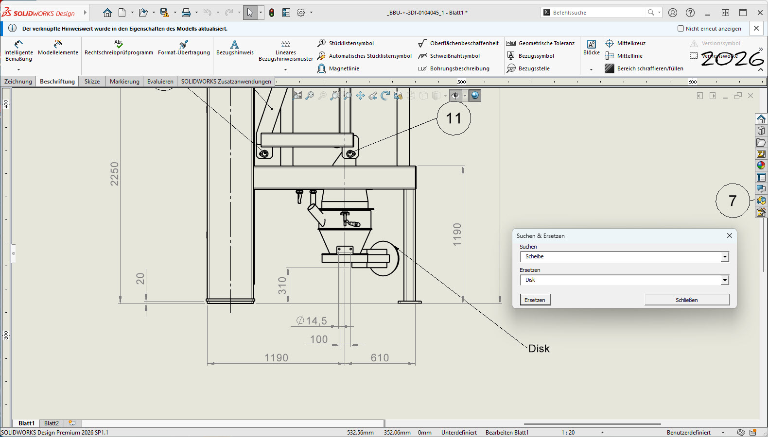 SolidWorks-Makro: erweitertes Suchen/Ersetzen in ZeichnungsnotizenHallo zusammen, ich stelle hier mal wieder ein kleines SolidWorks-VBA-Makro ein. Meine letzten Makros habe ich, glaube ich, vor rund 20 Jahren gepostet. Das Makro erweitert das normale Suchen/Ersetzen in Zeichnungs-Beschriftungen bzw. Notizen um ein paar Dinge, die mir im Alltag gefehlt haben: