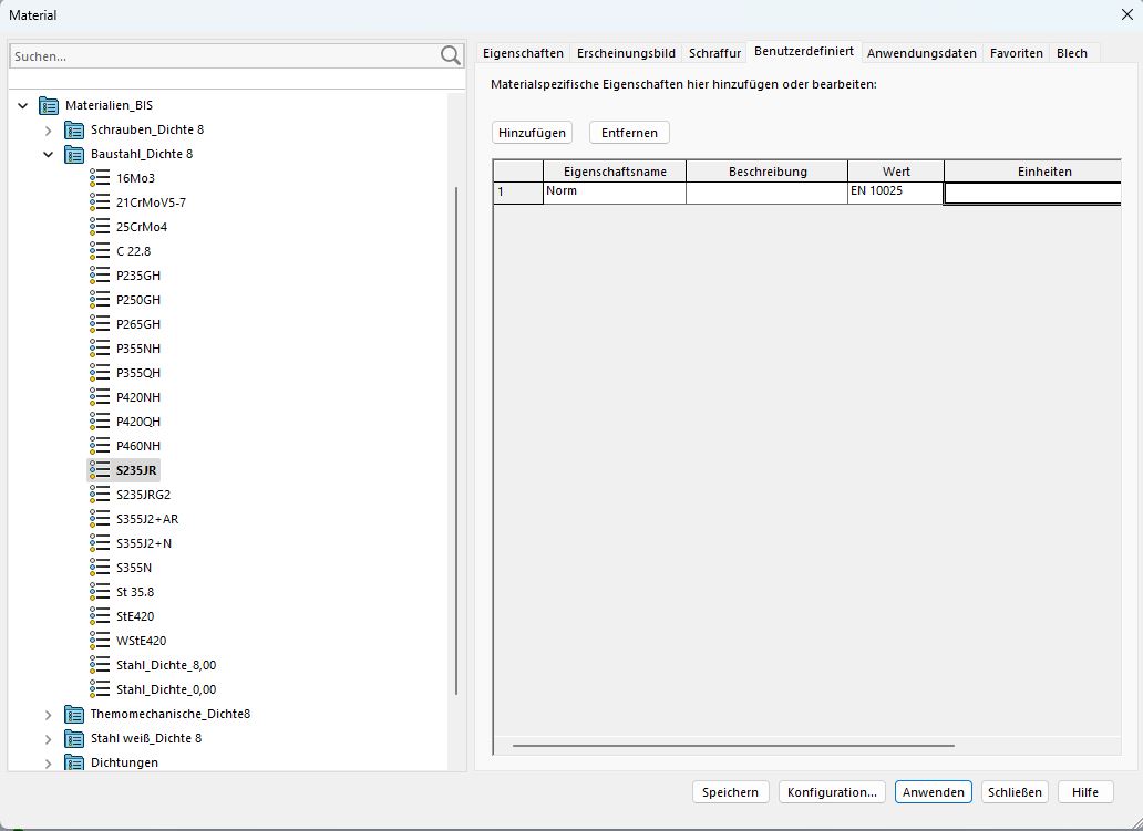 Hallo liebe SWX  User, Ich nutze Soldiworks 2025 Servicepack 5.0 Ich bin aktuell dabei eine Zuchnittsliste nach meiner "Stücklisten" Vorgabe zu erstellen. Ich möchte dass in meiner Zuschnittsliste eine Spalte mit den Materialnormen hinterlegt wird. Die Materialnorm hätte ich in den Benutzerdefinierten Eigenschaften beim Material Hinterlegt. (Hier habe ich jetzt beim Material S235JR die Norm "EN 10025" hinterlegt) Wie kann ich diesen Wert jetzt in meiner Zuschnittsliste anzeigen lassen ? Ich bekome es nicht hin, dass die Benutzerdiefinerte Eigenschaft der Norm in der Zuschnittsliste angezeigt wird. Vielen Dank im Voraus Liebe Grüße aus Österreich Eine Antwort auf diesen Beitrag verfassen (mit Zitat/Zitat des Beitrags) IP |