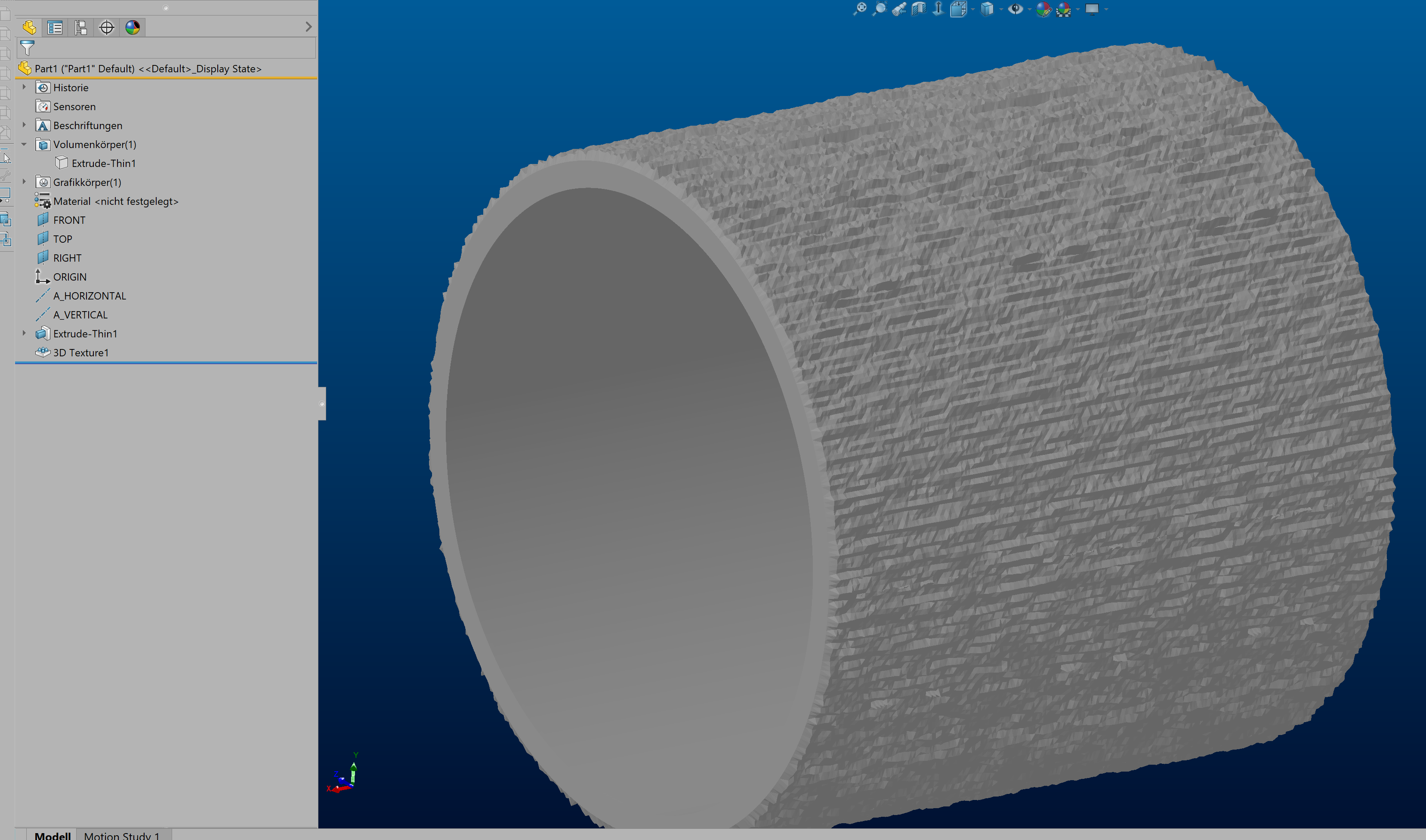 Hallo Huber, vielleicht wenn du erklärst, was dein Zeil ist, kann man dir besser helfen, da dein Wunsch eine Zeitintensive Angelegenheit wird. Ich vermute mal ins Blaue, dass du ein Photorealistisches Model erzeugen möchtest, welches man dann naturgetreu darstellen kann. klingt nach einer sinplen Aufgabe, wird aber ein mords Aufwand werden. Zylinder erstellen dann mithilfe von Ebenen Skizzen erstellen, an denen du eine weiter Skizze im rechten Winkel erstellst, deine Ausschnittkontur erstellst und Schnitt für Schnitt wegschneidest. nach 5, 10, oder 15 Grad, kannst ja das Muster als Kreismuster vervielfältigen. Wie gesagt, mords Aufwand... LG Martin