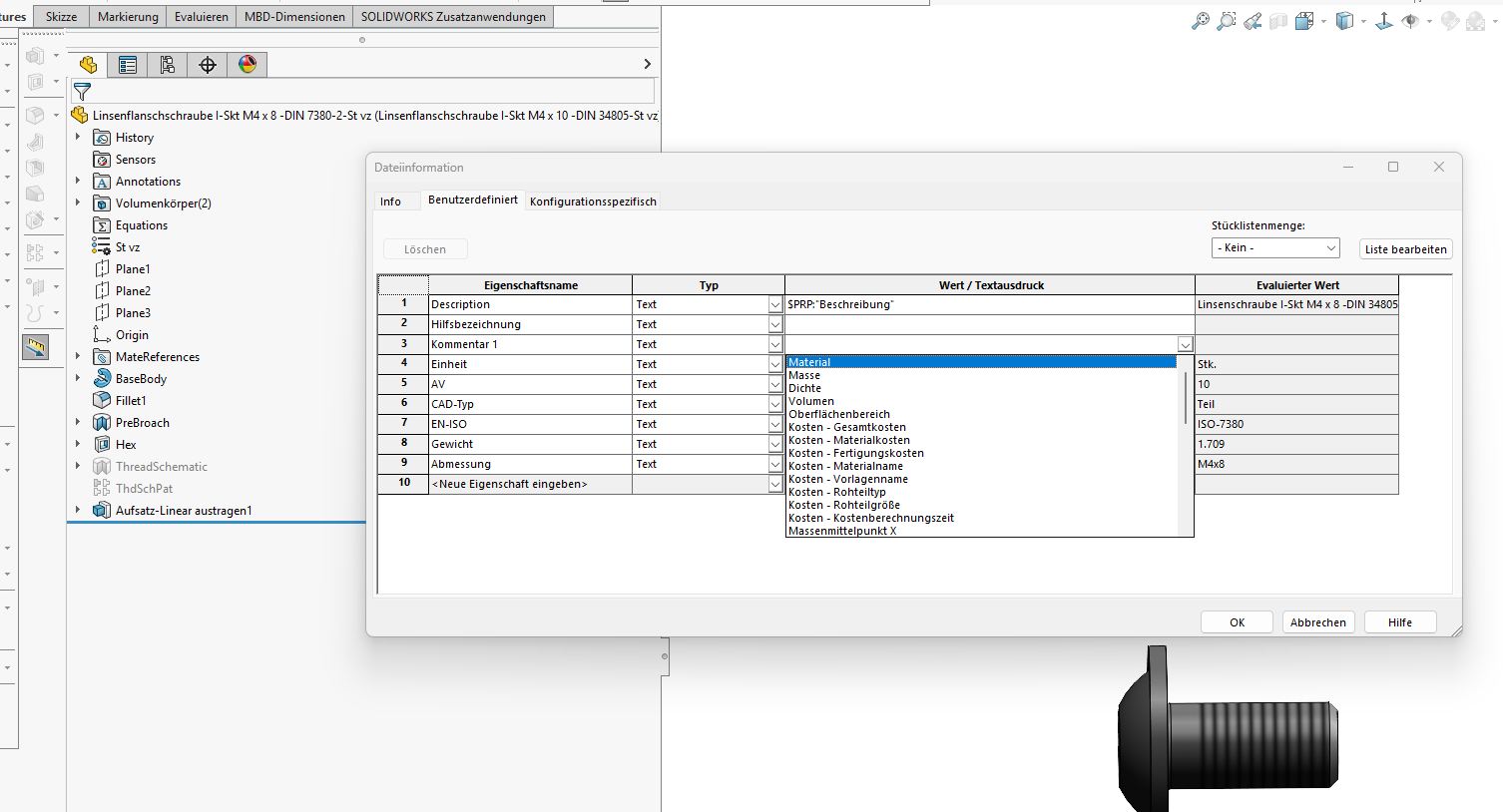Es gibt da neben der normalen Dateiaktualiserung bei SWX  -Updates noch zwei weitere Aktualisierungen, die man manuell oder per Script anstoßen muss. Wenn du die Dateien also komplett aktualisieren willst, musst du im Popup des obersten Eintrags im Featuremanager "Benutzerdefinierte Eigenschaften aktualisieren" ausführen. Es wird dann die Eigenschaftsverwaltung verändert und der Reiter taucht auf. Beachte bitte, dass man diesen Vorgang nur einmal durchführen kann, danach ist der Menüeintrag unsichtbar. Dasselbe Verfahren gilt für "Kosmetisches Gewinde aktualisieren"