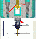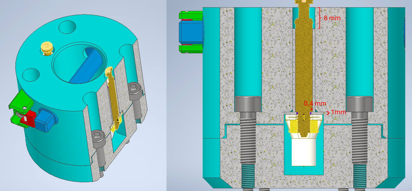 So, meine Zeichnung ist endlich fertig geworden. 🙂 Ich habe den Hochstromkontakt in eine 1 mm starke Umhüllung gepackt. Die Umhüllung selbst besitzt einen Fuß, der wiederum an mein Bauteil geschraubt ist, damit sie fixiert ist und nicht nach unten rutschen kann. Die Umhüllung (aus POM oder PEEK) kommt anschließend in einen Aluminiumblock. Auf den Hochstromkontakt wird bei vollem Hub – der nun passen sollte – laut Datenblatt eine Kraft von 12 N ausgeübt. Im Datenblatt sieht es in der Zeichnung so aus, als könnte man die Auflagefläche etwas größer gestalten und das M6-Gewinde eventuell direkt durch das POM bzw. PEEK führen. Was meint Ihr dazu? Würdet Ihr die Umhüllung unten nur mit einem Kernloch versehen und anschließend mit einem M6-Gewindeschneider ein Gewinde in POM bzw. PEEK schneiden? Dadurch hätte man eine etwas größere Auflagefläche. Wie würdet Ihr das interpretieren bzw. wie würdet Ihr vorgehen? Gruß Mücke ------------------ [Inventor Professional 2026] - [WIN 11] Eine Antwort auf diesen Beitrag verfassen (mit Zitat/Zitat des Beitrags) IP |