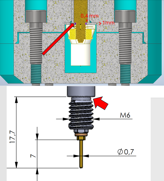 Ok, danke für den Hinweis – jetzt verstehe ich, was Du mit dem Ø 0,7 meinst. Zur Klarstellung: An dem Ø 0,7-Stift wird kein Kabelschuh befestigt und dort wird auch keine Mutter angezogen. An dieser Stelle soll lediglich ein Messkabel angelötet werden, über das anschließend ein Schrumpfschlauch gezogen wird – sowohl zur Isolation als auch zur leichten mechanischen Entlastung. Die eigentliche mechanische und elektrische Hochstrom-Anbindung erfolgt ausschließlich über das M6-Gewinde mit Kabelschuh und Mutter. Mir ging es in meiner Frage primär um die Auflagefläche oberhalb des M6-Gewindes (roter Pfeil in der Zeichnung) und die Überlegung, dort statt eines 6-mm-Durchgangslochs ein 5-mm-Kernloch mit geschnittenem M6-Gewinde im POM/PEEK vorzusehen, um die Auflagefläche zu vergrößern. Leider kann ich die Gefahr einer Verbiegung des Ø 0,7 beim Anziehen noch nicht ganz nachvollziehen bzw. verstehe ich sie noch nicht richtig. Wie meinst du das mit dem konisch werden? Meinst du, dass ich beim Anziehen der Mutter aufpassen muss? Sorry, ich steige da nicht so richtig dahinter. Ich möchte es auch nicht wegdiskutieren, im Gegenteil, ich möchte gerade verstehen, was du meintest. ------------------ [Inventor Professional 2026] - [WIN 11] Eine Antwort auf diesen Beitrag verfassen (mit Zitat/Zitat des Beitrags) IP |