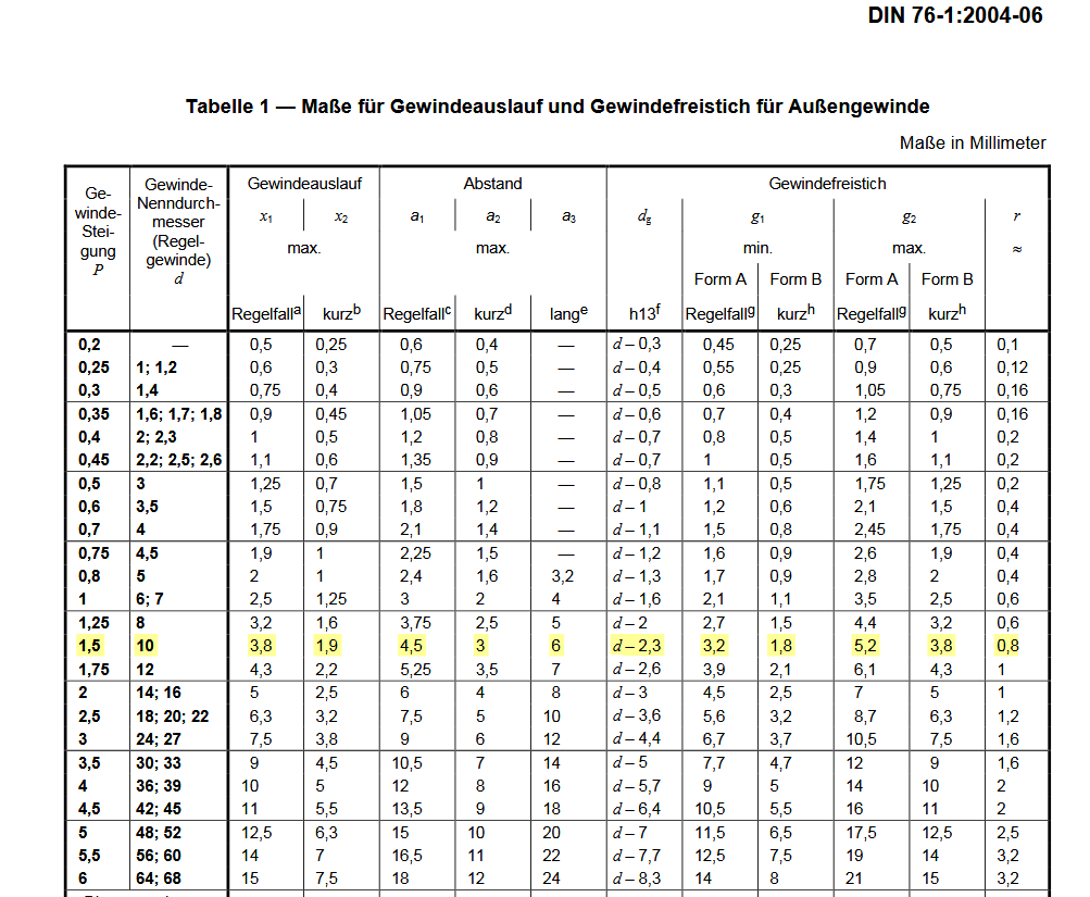 Erstens, bitte auf das Urheberrecht achten. Du darfst auf keinen Fall ganze Seiten einer Norm hier einstellen. Hast Du auch eingehalten. Mutter und Bolzen müssen das gleiche Gewinde ( nominal ) sein sonst lassen sie sich nicht verschrauben oder nur gewaltsam. ( also Steigung und Nenndurchmesser ) Ein Gewinde ist mit Durchmesser Ø und Steigung P eindeutig definiert. Die Tiefe der Gewinderille ergibt sich aus der Norm . Deswegen reicht , wie bei der ISO-4755 , die Steigung für die Auswahl des Freistischs aus. ------------------ Klaus Eine Antwort auf diesen Beitrag verfassen (mit Zitat/Zitat des Beitrags) IP |
