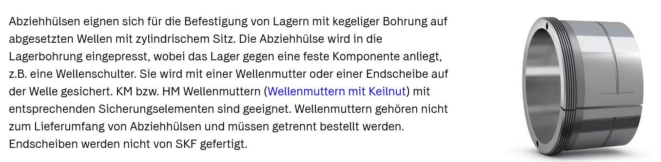 Hallo Gert Dieter, prinzipiell kannst Du schon eine Abziehhülse vorsehen, Du musst dann aber auf der Welle ein Wellengewinde (oder am Wellenende einen Deckel, den Du mit stirnseitigen Schrauben verspannen kannst) haben, um dei Abziehhülse in den Kegel des Lagers zu drücken. Du solltest auch die Möglichkeit haben, das Lager während des Spannens in der gewünschten Position halten zu können. Eventuell durch das Lagergeäuse/den Lagersitz? Ciao Eine Antwort auf diesen Beitrag verfassen (mit Zitat/Zitat des Beitrags) IP |