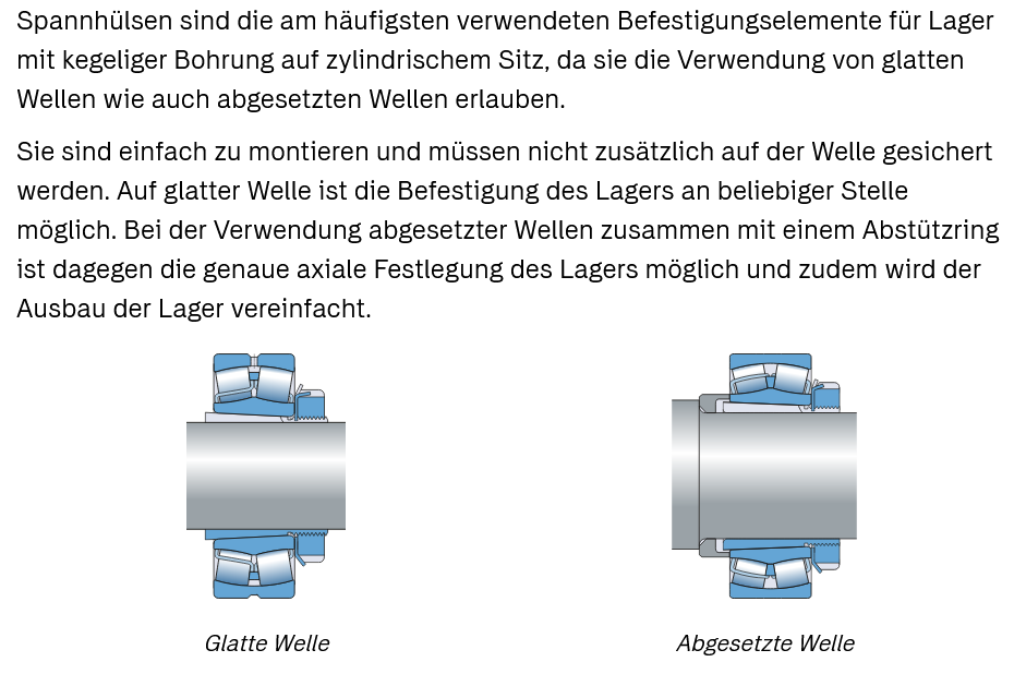 Folgender Fall: Eine glatte Welle, Durchmesser 80mm, ist in einem Pendelrollenlager mit Spannhülse gelagert. Wie im Bild links. Außer Radialbelastung tritt auch eine beträchtliche Axialbelastung nach links auf. Durch Erschütterungen hat sich wohl die Wellenmutter gelöst, und die Welle ist nach links heraus geflutscht. Montage des Lagers ist nur von rechts möglich. Ein Bund rechts ist daher auch nicht möglich; ein Bund links wäre machbar. Frage: Ist es sinnvoller, statt einer Spannhülse, eine Abziehhülse zu montieren? Bei der ist der Kegel ja anders herum, und die Welle würde sich dann fest klemmen. Was sind die Unterschiede, Vor- und Nachteile in der Anwendung? Danke für Eure konstruktiven Vorschläge! ------------------ Gert Dieter  Tu die schwierigen Dinge, so lange sie noch leicht sind. Laotse Eine Antwort auf diesen Beitrag verfassen (mit Zitat/Zitat des Beitrags) IP |