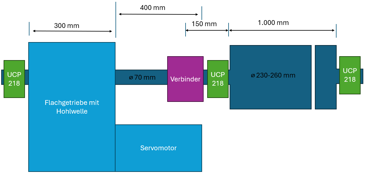 Um welche Rolle genau geht es dir? Die von mir verlinkte Rolle hat einen Durchmesser von 280 mm. Ich habe sie nur als Beispiel aufgeführt, denn die Rolle, die ich angeboten bekommen habe, ist leider nicht online verfügbar. Meine Rolle hat einen Durchmesser von 250 mm und einen Achsabstand von 460 mm. https://ww3.cad.de/foren/ubb/Forum202/HTML/001684.shtml#000013Aber das war, glaube ich, nicht der springende Punkt. Dir ging es um das Drehmoment von 6.000 Nm. Das habe ich tatsächlich vom Motorhersteller genannt bekommen. Wir haben jedoch festgestellt, dass der Motorhersteller die gesamte Achslast von 11,5 t auf zwei Rollen angesetzt hat und nicht auf vier Rollen (Beifahrer- und Fahrerseite haben jeweils zwei Rollen). Hier wurde berücksichtigt, dass der LKW voll beladen sein könnte und das Rad dennoch bewegt werden muss. Theoretisch kann ich das Getriebe direkt an die Welle schrauben. Das Getriebe hat eine Hohlwelle mit Schrumpfscheibe. Nur ist die Fläche für die Pressung am Getriebe zu lang und mein Wellenzapfen zu klein und kurz. Daher möchte ich ihn verlängern. Hinzu kommt, dass ich etwas Platz benötige, da ich mich mit meinem Werkzeug zwischen den Rollen bewegen kann, um das Profil zu vermessen. Dafür muss der LKW nach hinten gefahren werden, um die Räder manuell wechseln zu können.
