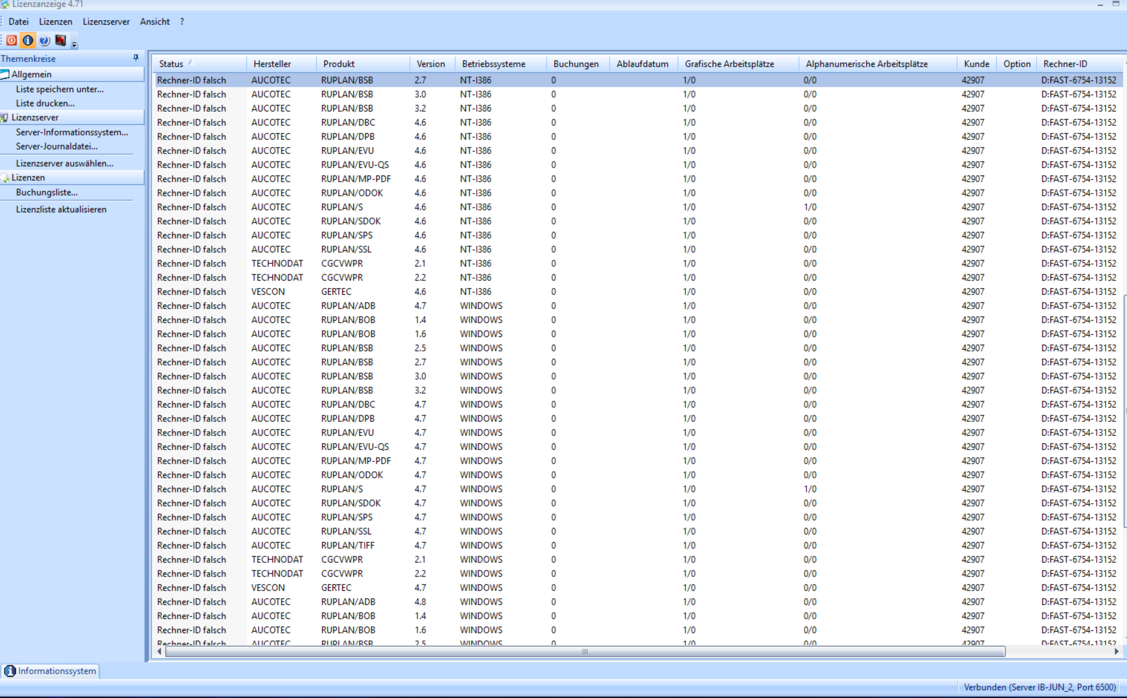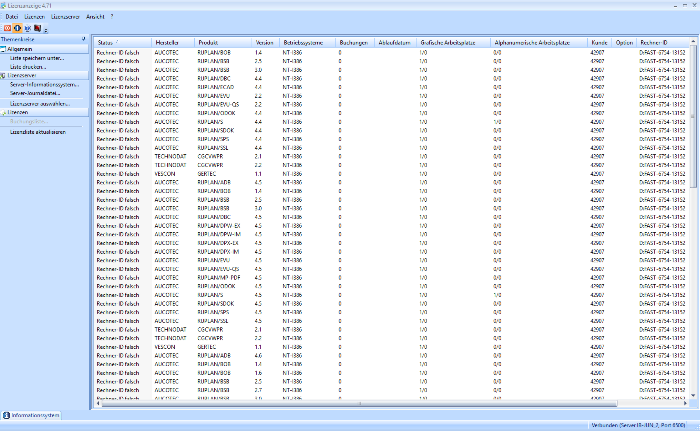hallo, so jetzt habe ich mir das bei uns nochmal angesehen. durch den wechsel auf einen neuen rechner is natürlich auch die mac-adresse , netzewerksadress usw. anders. d.h. du brauchst eine neue für diesen rechner gültige liz_db, ausser du lässt die lizenz auf dem alten rechner weiter laufen und benutzt den als lizenzrechner. bei status sollte nämlich "gültig" stehen. bei dir ist der eintrag "rechner-id falsch". ist mir noch eingefallen: verwendest du einen dongle? dann ist die lizenz auf den dongle und du solltest den rechner wechseln können. wenn die lizenz auf deinen rechner gekoppelt ist dann brauchst du die neue liz-datei