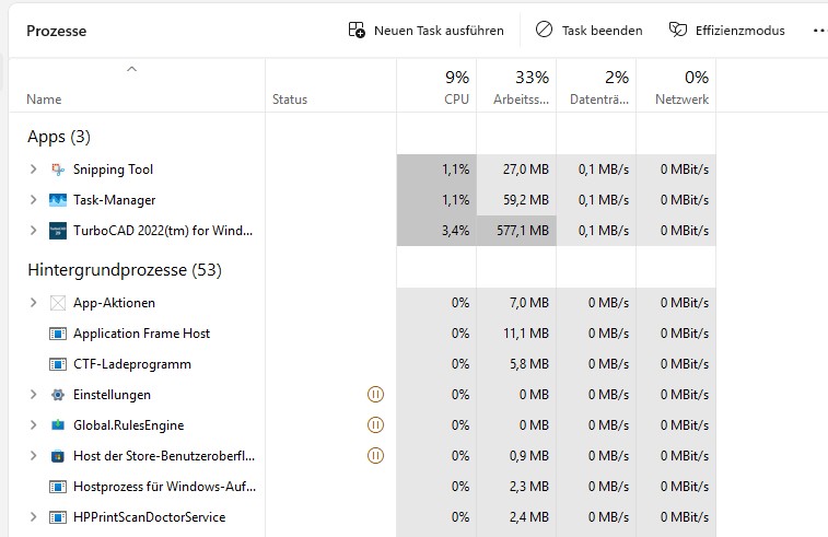 Hallo Mischele, geh auch mal im Taskmanager statt auf Prozesse auf Leistung. Da kann Du während des Arbeitens deine CPU oder den Speicher beobachten. Kürzlich gelesen ?) Bei letzten Windows 11 Update ist wohl ein Bug drin das den Rechner verlangsamt weil im Hintergrund der Taskmanager immer mitläuft. Grüße ------------------