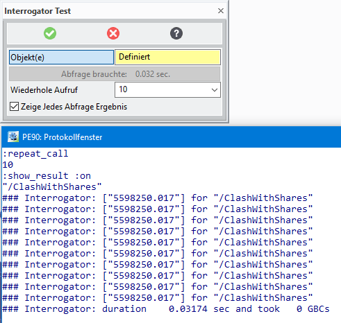 - In der Konsole erscheint ein Einzeiler mit dem (formatiertem) Return Value vom interrogator und dem Objekt-Pfadname. Und ggf. die geworfenen Fehlermeldungen.
