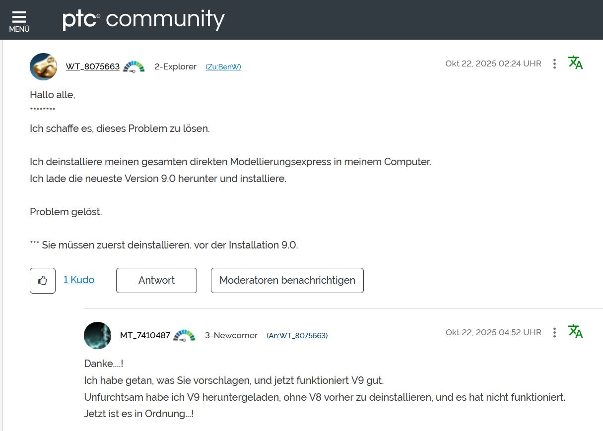 Vielleicht könnnn sich mal alle [b]PE-User mit PTC-Community account in den Thread https://community.ptc.com/t5/System-Administration/Can-t-use-Creo-Elements-Direct-Modeling-Express-Activation-Key/m-p/1039081#M296 mit reinhängen um dort bei PTC mehr Aufmerksamkeit zu erzeugen? - Das wäre zumindest mein Vorschlag.